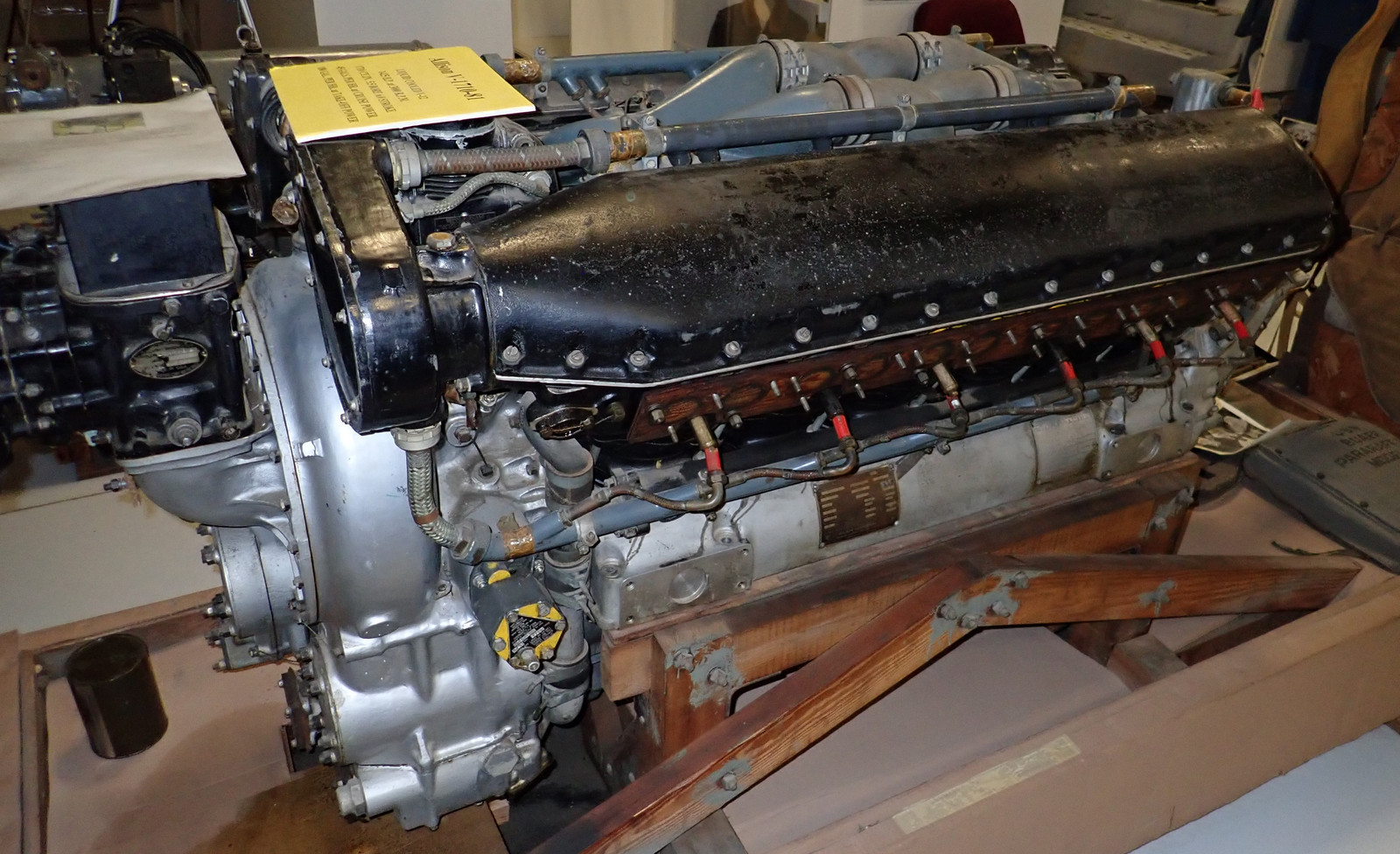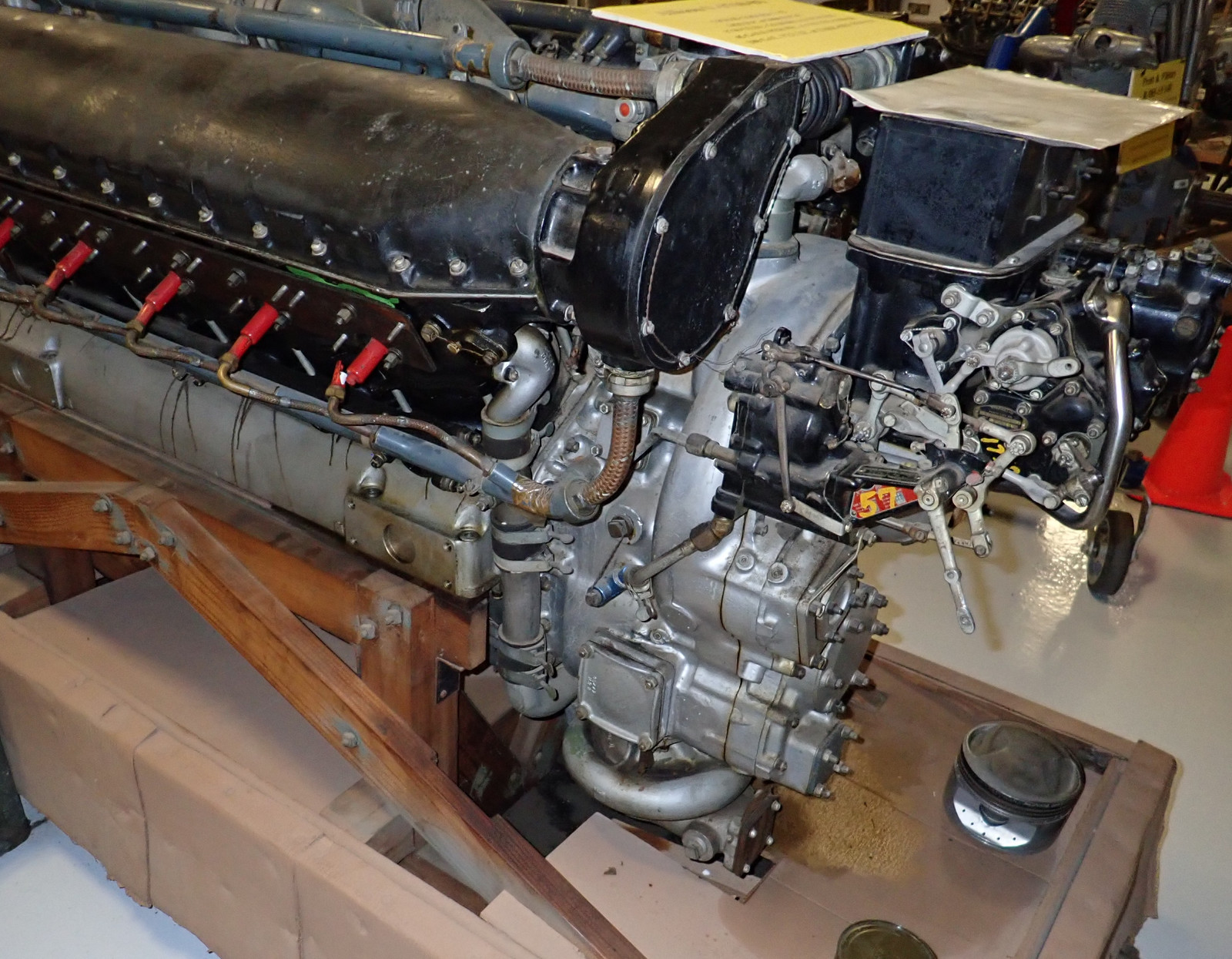 Moving forward from 1915 to 1930, this is an Allison V1710-81. This engine powered the early P-51A, before the (rather superior) Rolls Royce Merlin V-12 drastically improved high altitude performance in later models. Adding 4 cylinders over the OX-5, the 1710-81 is rated at 1000 horsepower for takeoff, and 860 horsepower continuous. The left side here has the carburetor (black box on top), the supercharger (large round thing), and various other bits of the accessory side of the engine, with the propeller being mounted on the far end. It’s a rather dramatic development in 15 years of aviation engine work, but that’s the sort of speed of improvement we had going at the time!