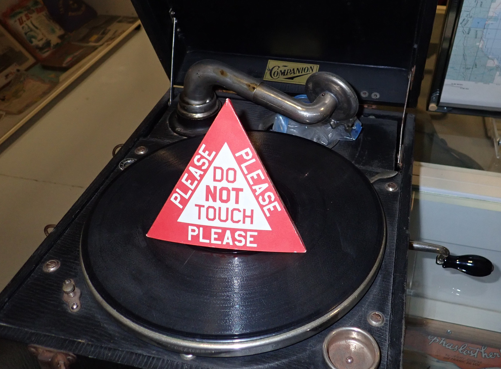 Vinyl was cool back in the day, and it’s still cool now! This is a mechanical turntable with a diaphragm at the needle end and a sound tube down to the cabinet underneath. I’m not sure I want to know what the stylus pressure on the record is, though.
