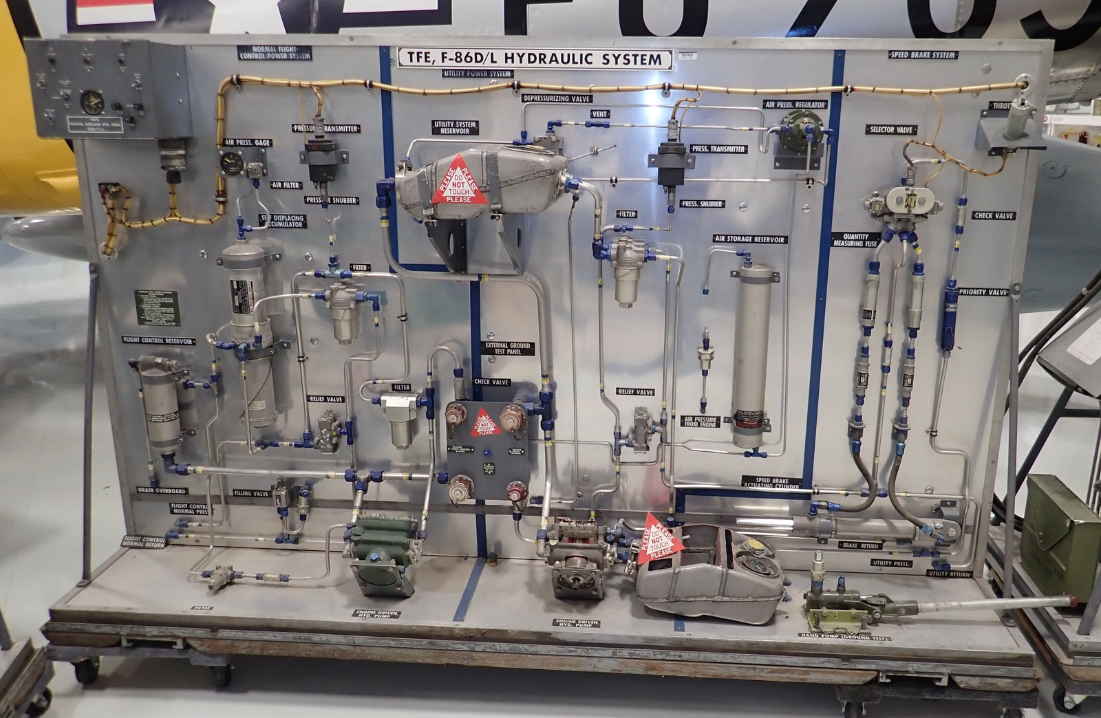 Next to it, a few “training system” boards are on display - one for the main hydraulic system, one for the main landing gear, and one for the nose gear. I’ve not seen this sort of display before, but it’s a really good way to display the system in a “hands on” sort of way - this is a great way to be able to trace flows, see how systems interact, etc. It’s not only useful for mechanics - it’s very useful for pilots to have an understanding of what works how, especially if you’ve been shot and are trying to reason about what might still function to get you back down safely with a usable airplane.