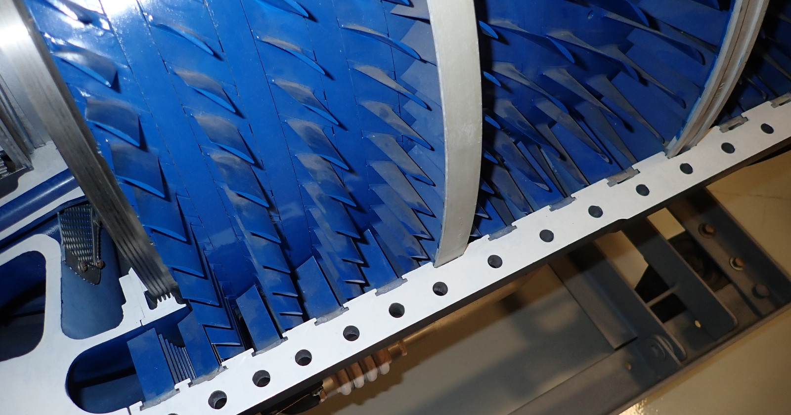 It’s a bit hard to see the angle, but between each row of compressor blades, a set of stators (visible in the bottom half) help redirect the airflow into the next stage. Without them, the air would just end up swirling around instead of being compressed - but the stators are curved so they capture the rotation of the air and help convert it into yet more static pressure before the next stage. Each stage of the compressor also has slightly different fin shapes and angles to handle the expected air pressure at their stage.