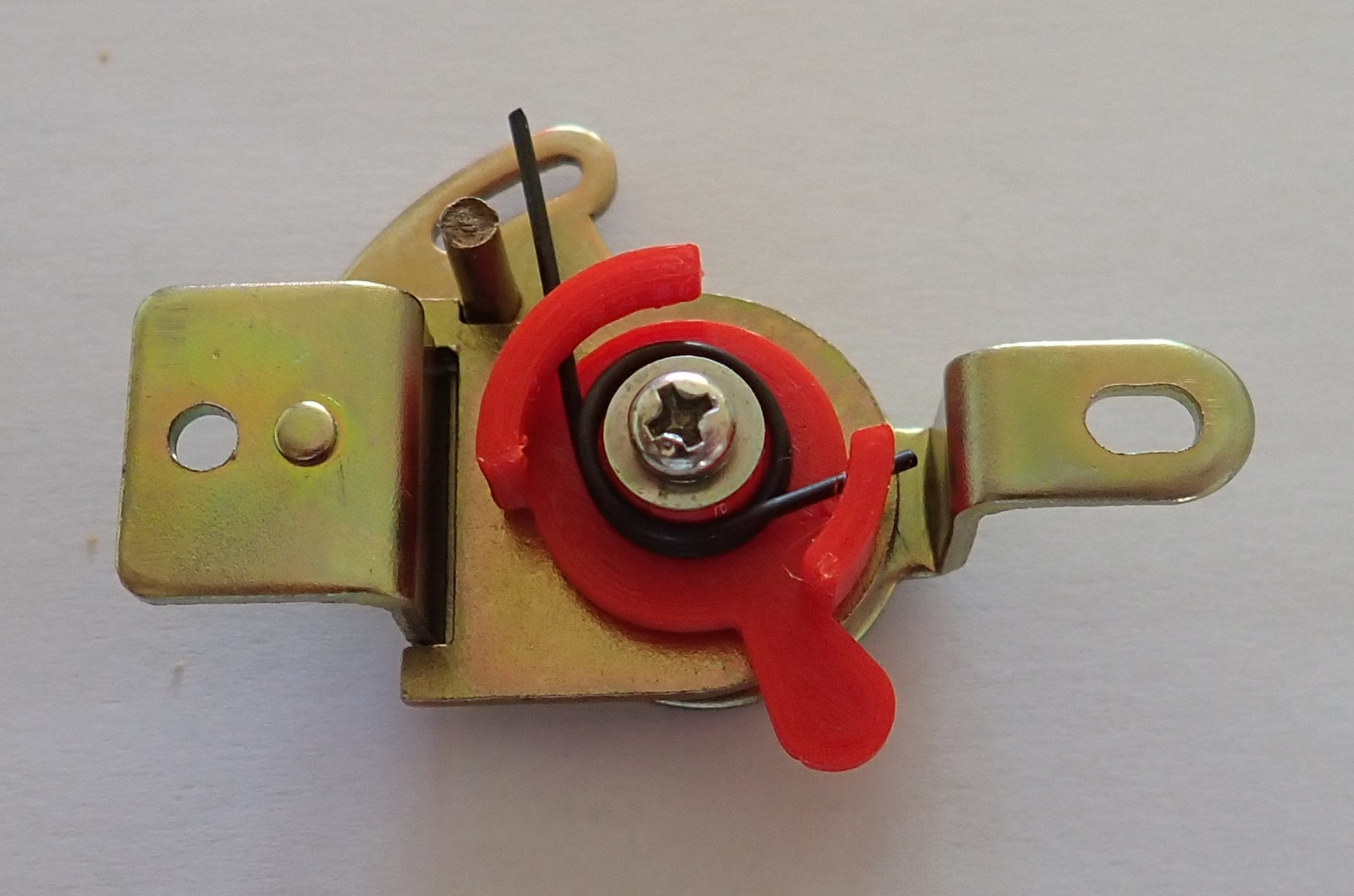 Installed back in place, you can see the new, red lever resting against the actuator lever. This is the “down” position. There’s a bit of spring tension on the rod, but it just helps keep anything from rattling.