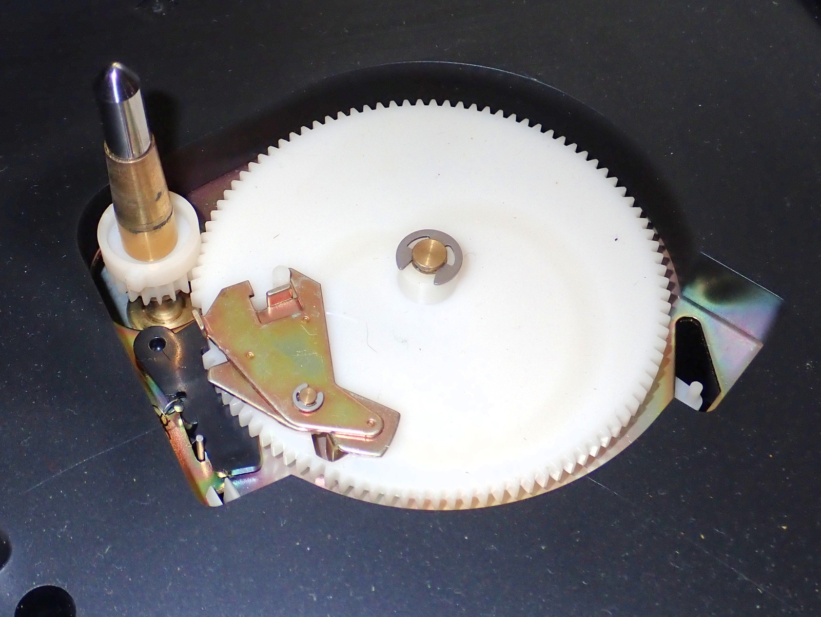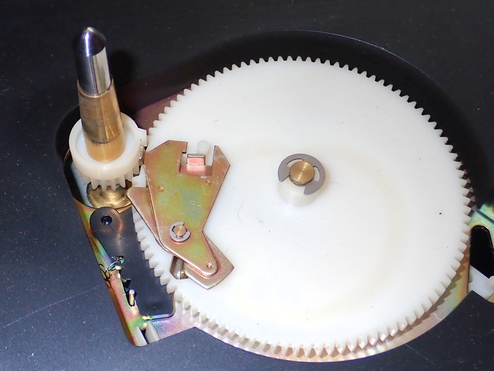 Under the massive base plate, the exposed gear is part of the reject mechanism. The central shaft is turned by the motor, and this large gear can be engaged to cycle things back out at the end of the album.