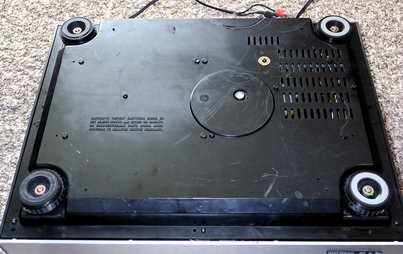 Flipping the unit over (carefully, after having secured the tonearm, and realizing that the plastic cover isn’t screwed in place but will drop freely out of the hinge slots), there are eight screws around the perimeter, plus three in the center that have to be removed to take the base plate off.