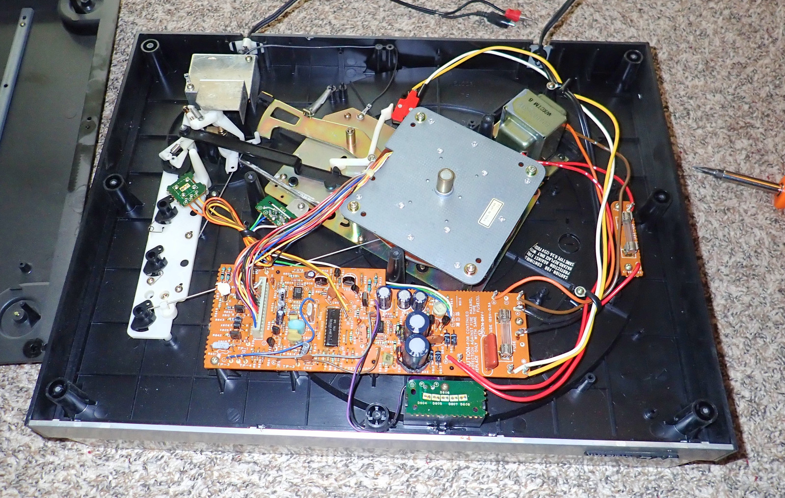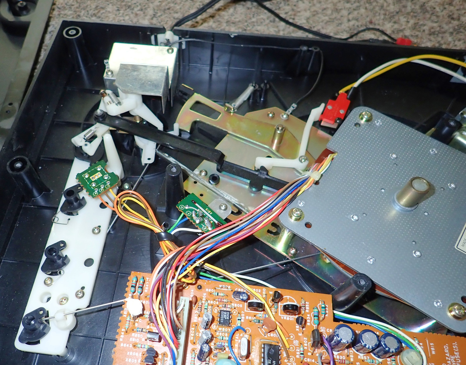 With the bottom off, you can see the guts. There’s a rather simple looking main PCB, the drive motor in the center, a transformer in the top right for power, and the various controls and levers on the left. Yes, the cueing mechanism is missing in this picture - for reasons that will soon become clear.