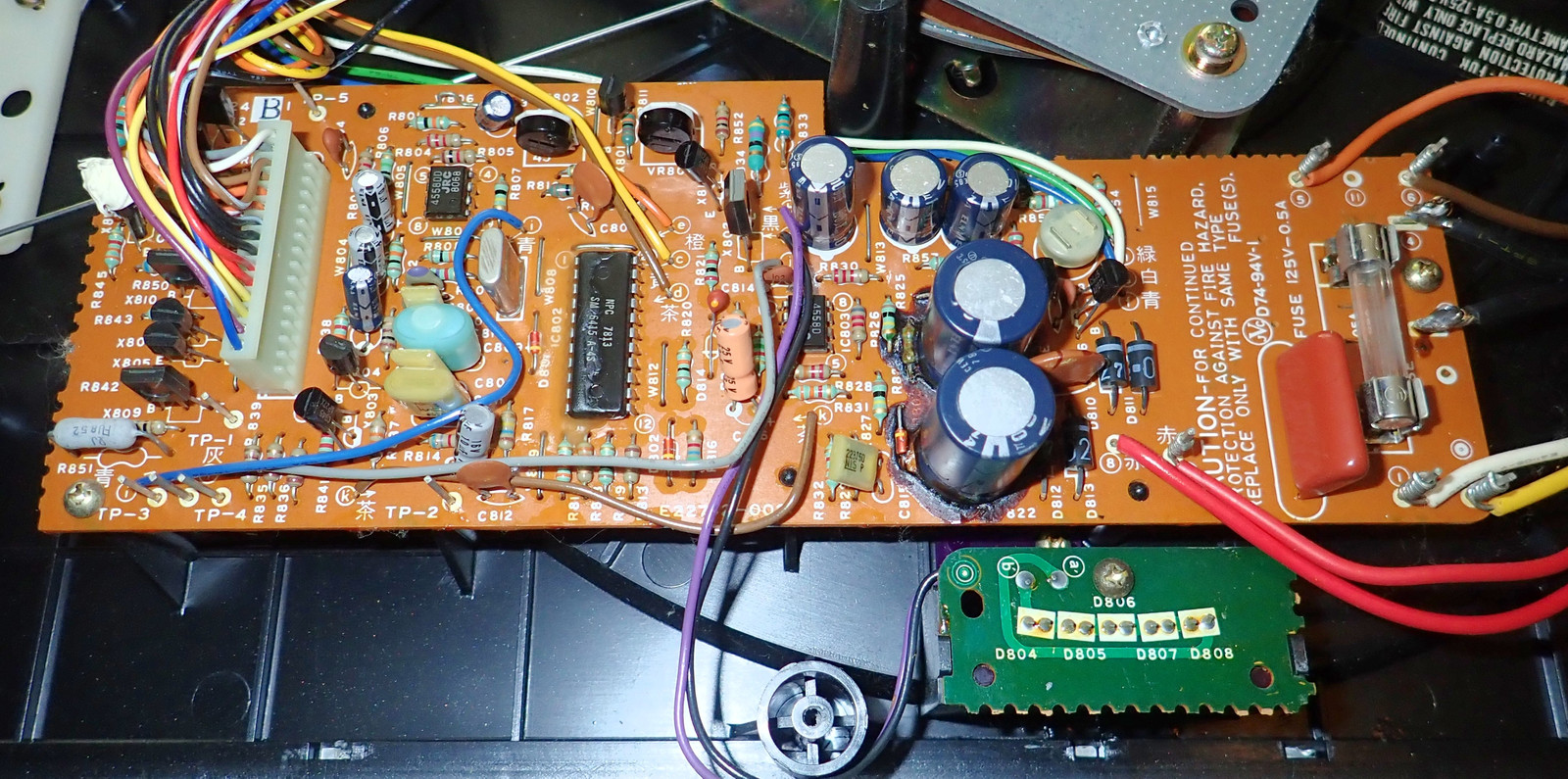 With the exception of a single IC in the center, this board is all through-hole mounted components. I’m sure someone might consider replacing (or at least checking…) some of the capacitors, but as the unit is working fine and I see no evidence of leakage, I’m just going to leave them alone for now. Seriously, a single sided PCB with through hole parts! So nice!