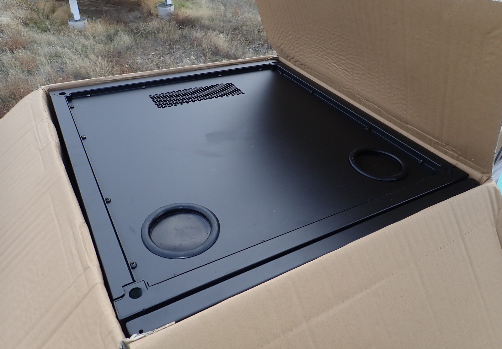 They bolt in. Make sure they’re snug, because once this rack is loaded, you’re not going to want to be under it again. On the bottom, there’s one opening for wiring. On the top, there are two. This rack is really designed to have cabling coming in the top - you can do it from the bottom, as I have, but it’s quite a bit more work than just coming in from the top. Consider that if you’re designing a system around this rack design from scratch. Of course, you don’t need to use the rack either - but “having everything in a nice, custom fit case, with busbars on the side, and good coasters” is a nice little feature to have.