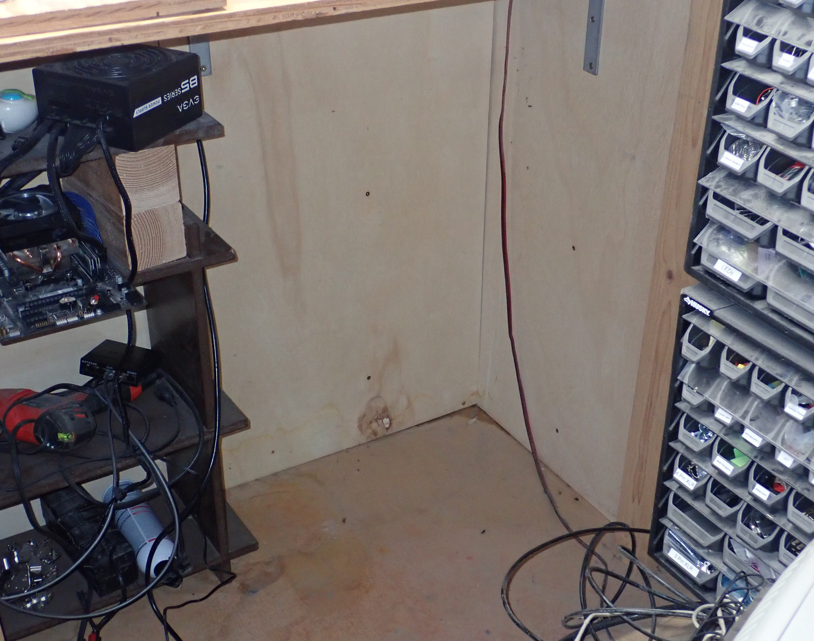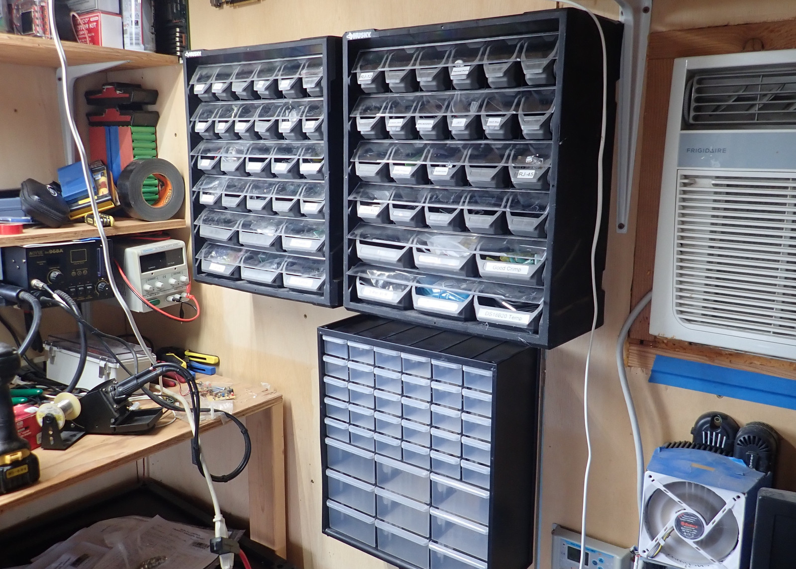 This time, I was smart. I didn’t tighten down the screws after I mounted the stuff-holder-boxes on them, so I can remove them far more easily in the future if I have to! Each of these hangs on four screws, but I’d gotten the bright idea to tighten them down in the past. Anyway, this solves my problem, gives me more storage space, and, most importantly, let me wheel the box of batteries where I wanted it!