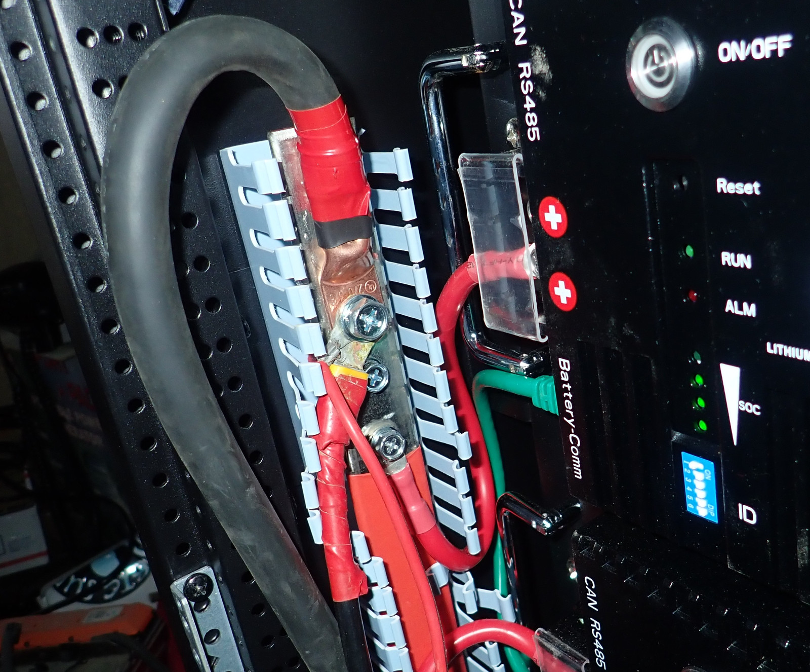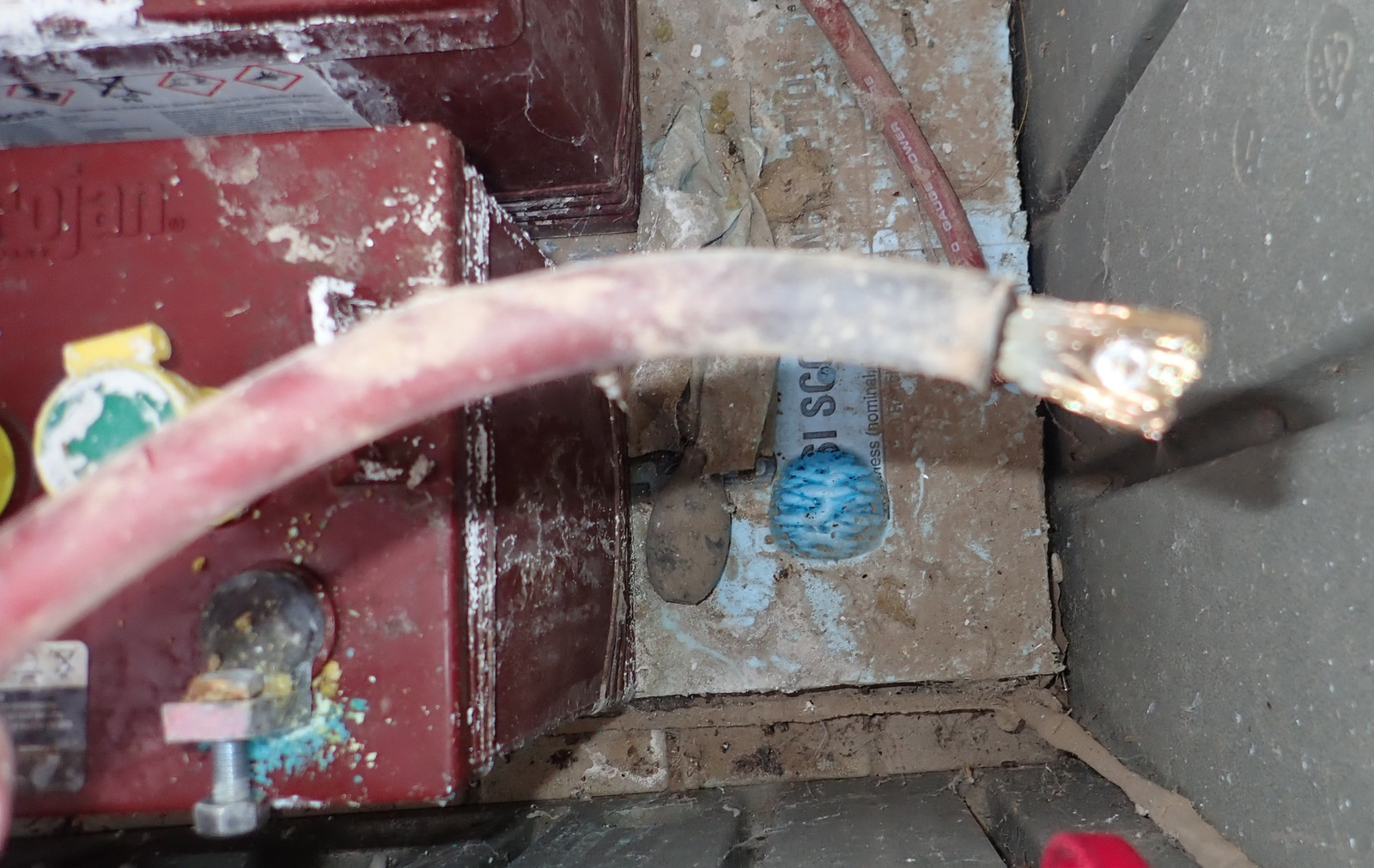 You can also see quite a bit of corrosion on the battery terminal. If you’re doing a lead acid bank, it’s worth finding some sort of coating for the terminals that stands up to acid and won’t corrode the copper (I think a layer of vasoline works fine). The bank still works - but it’s messy, and it will eventually cause problems for you.