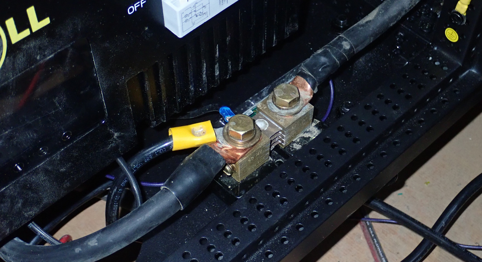 All of the other connections are on the far side of this shunt. Power out to the inverter, charging current from my various solar arrays, all comes in on the far side so it can be measured. This shunt doesn’t see current flowing from the charge controllers into the inverter directly, though I used to have a load shunt that showed me “inverter DC draw.” I couldn’t fit it in here, and I’ve got some ideas for other places to mount it down the road closer to the inverter. But, for now, it’s missing in action.