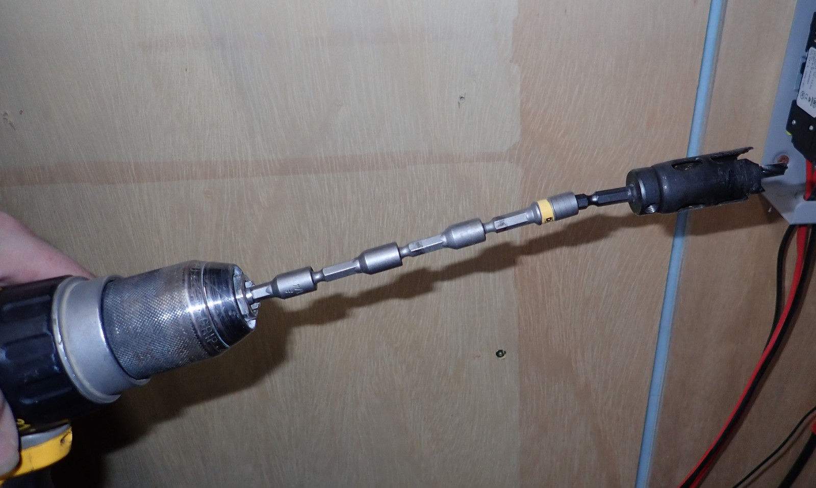 If you recall my office build, you’ll recall that my walls are rather thick. I’ve got standard 2x4 studs for the walls (filled with rock wool), then 2” of foamboard on the inside, then some plywood. If you’ve ever had a bunch of 1/4” drivers laying around from “free drivers in boxes of screws” (say, from a deck), and you want to build an extender - superglue is your friend, and I’ll suggest not using a magnetic (but shallow) bit on the end. The hole saw wiggles around a bit too much.