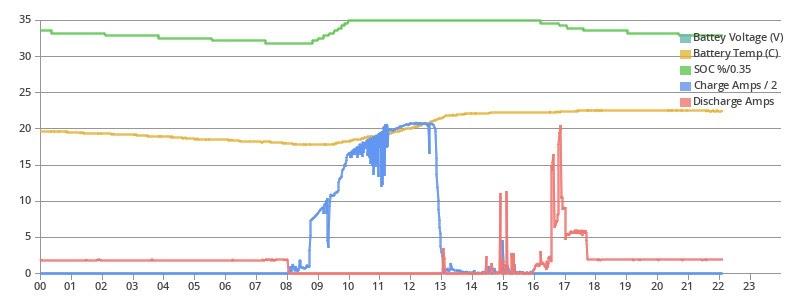 The EG4s? Nothing of the sort. They charge, and charge, and then when they’re full, they just hit a brick wall. Here, a reasonably depleted bank charged as the sun came up, and when it was full, it was full. Wham. Down to float, and hold it there. It’s a very different style charging, though it still benefits from a long solar day in terms of “not needing to use batteries because you can directly power loads off solar.”