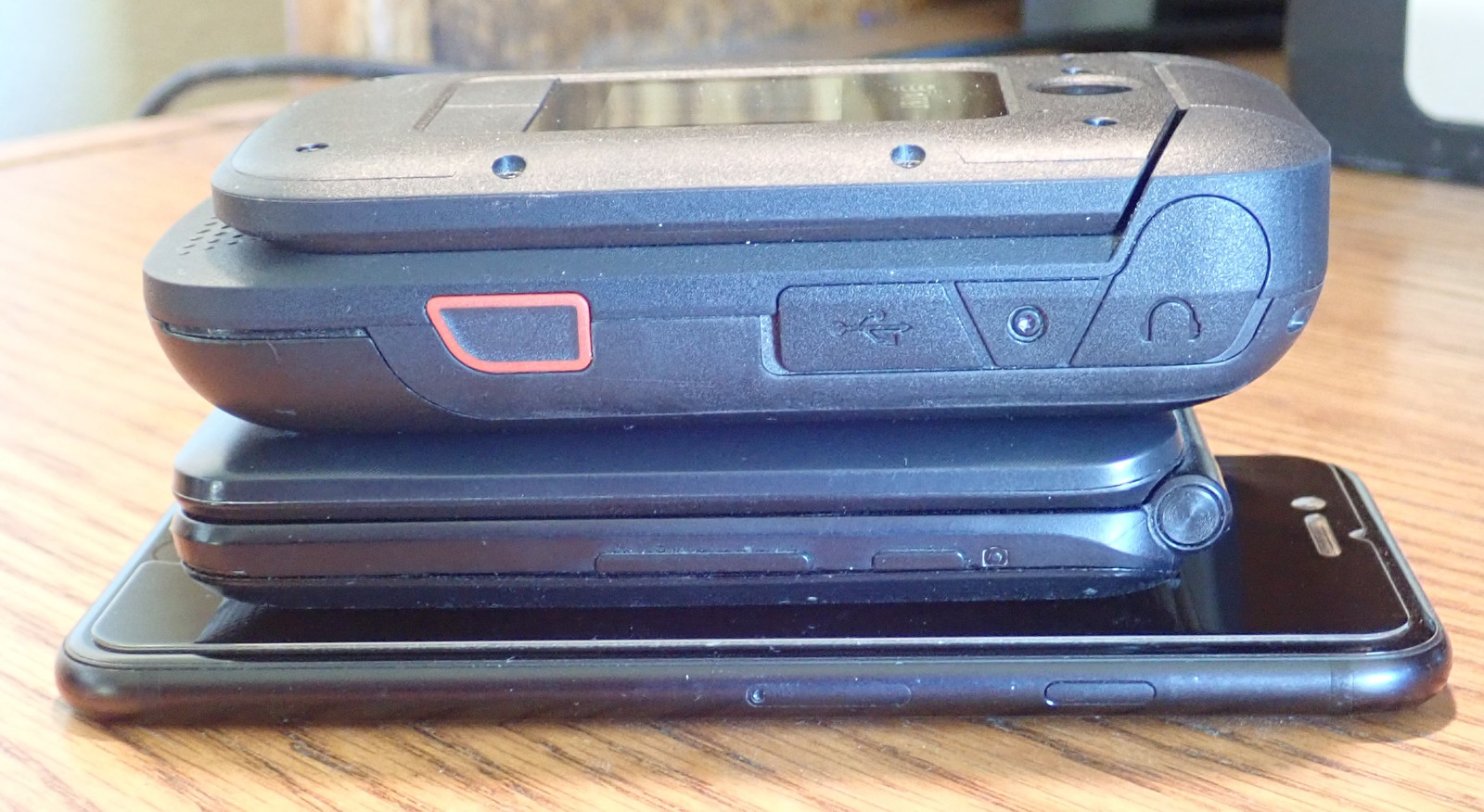 But I cannot reiterate enough: This phone is massive. It’s thick. It’s heavy. It feels amazing in the hand. I’ve got a stack here of some phones, with the XP3+ on the top, crushing the Flip IV in the middle, and an iPhone 2020 SE (so iPhone 6, 7, 8, basically anything of the last few generations with a home button) on the bottom. But, on the plus side, there’s absolutely no reason to bother putting this phone in a case!