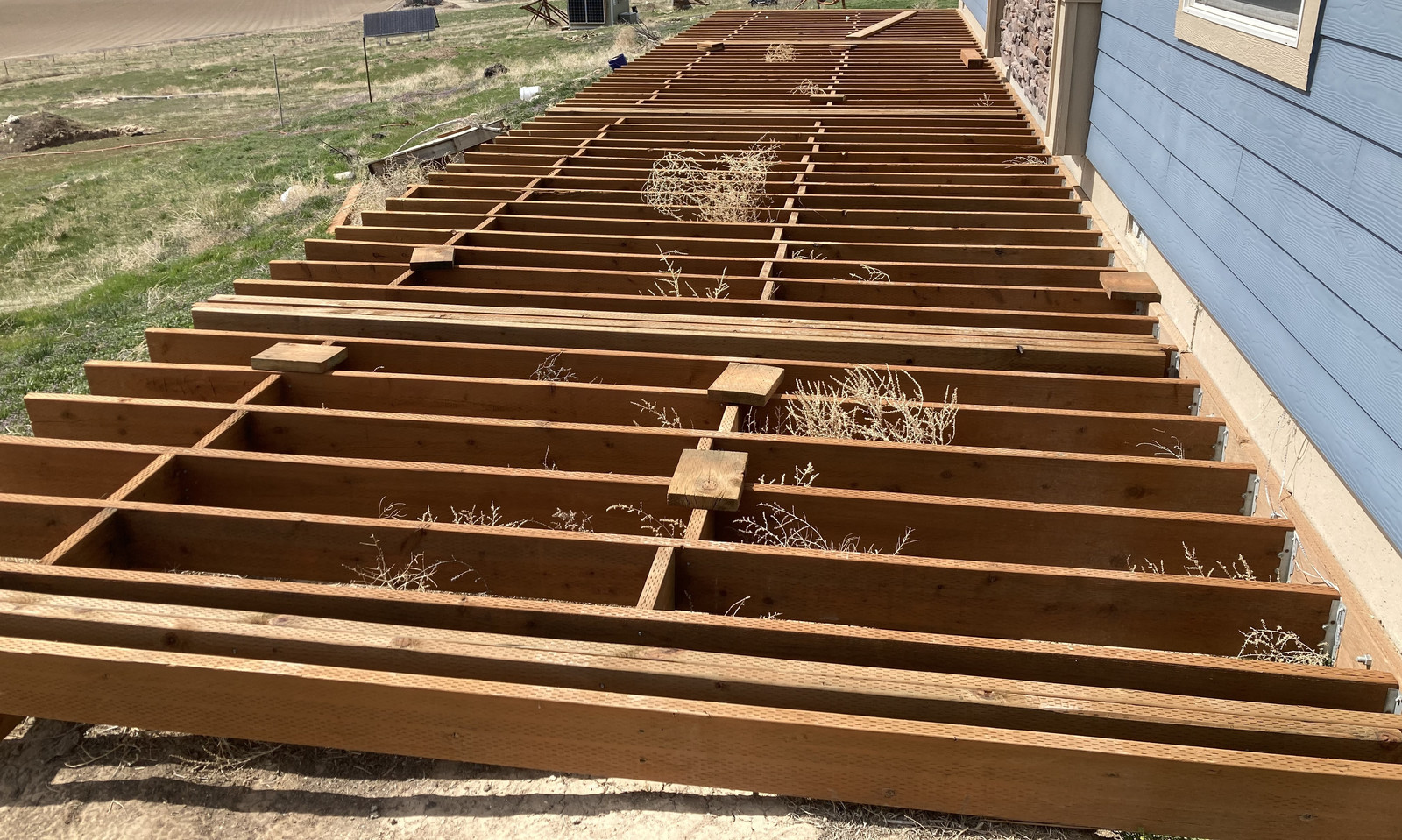With the framing done, all I have to do is plane the boards so the top is level (it matters with Trex, far less so with wood decking), apply joist tape, and lay down about 660 square feet of Trex…