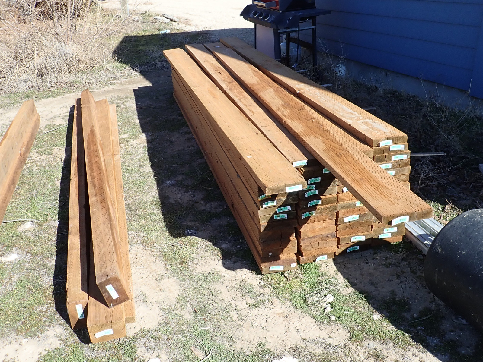 Pressure treated is always annoying to stack and dry, because it will warp given half a chance, so take the time to make sure it’s going to dry at least mostly straight. I probably should have added a few more spacers in the middle between boards for air circulation here, but it was more or less fine.