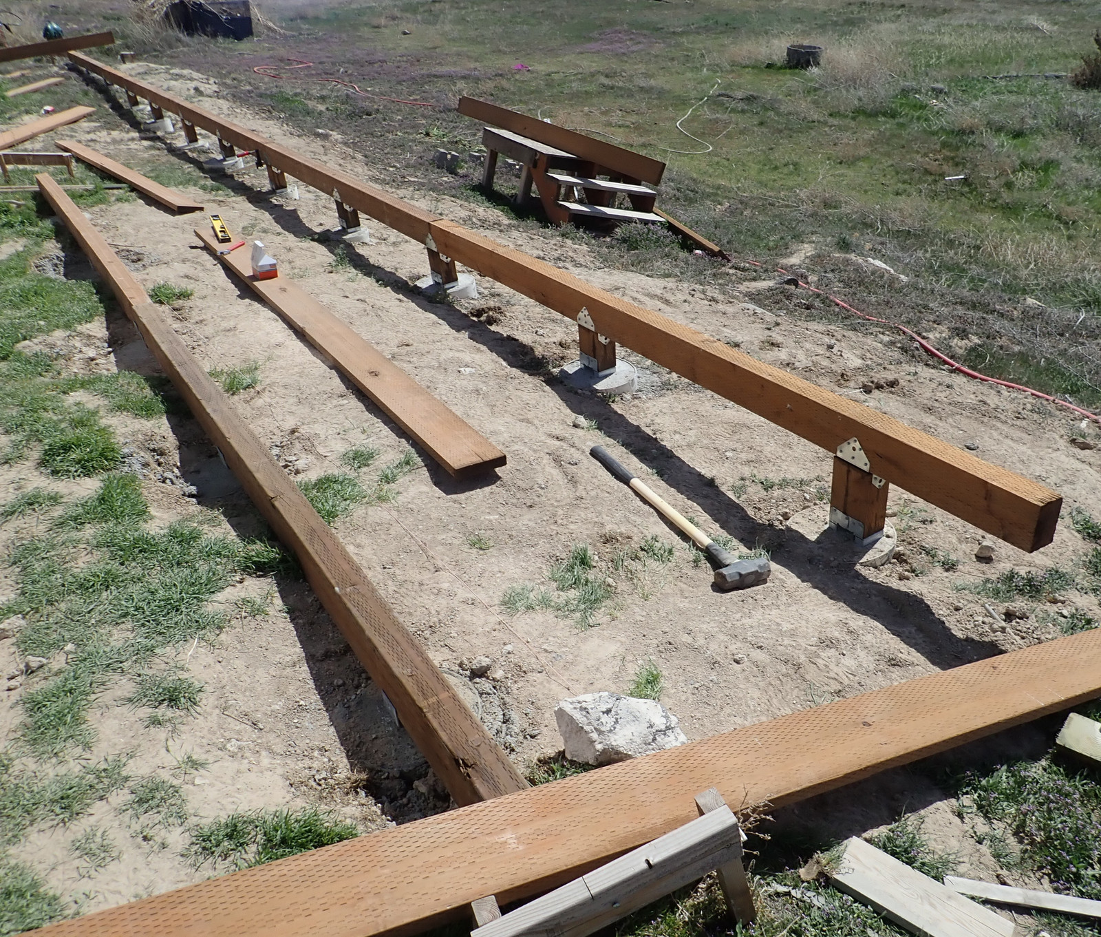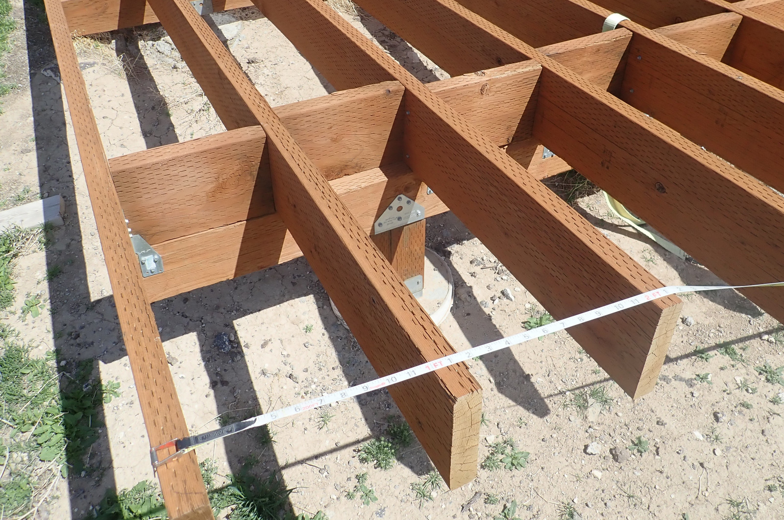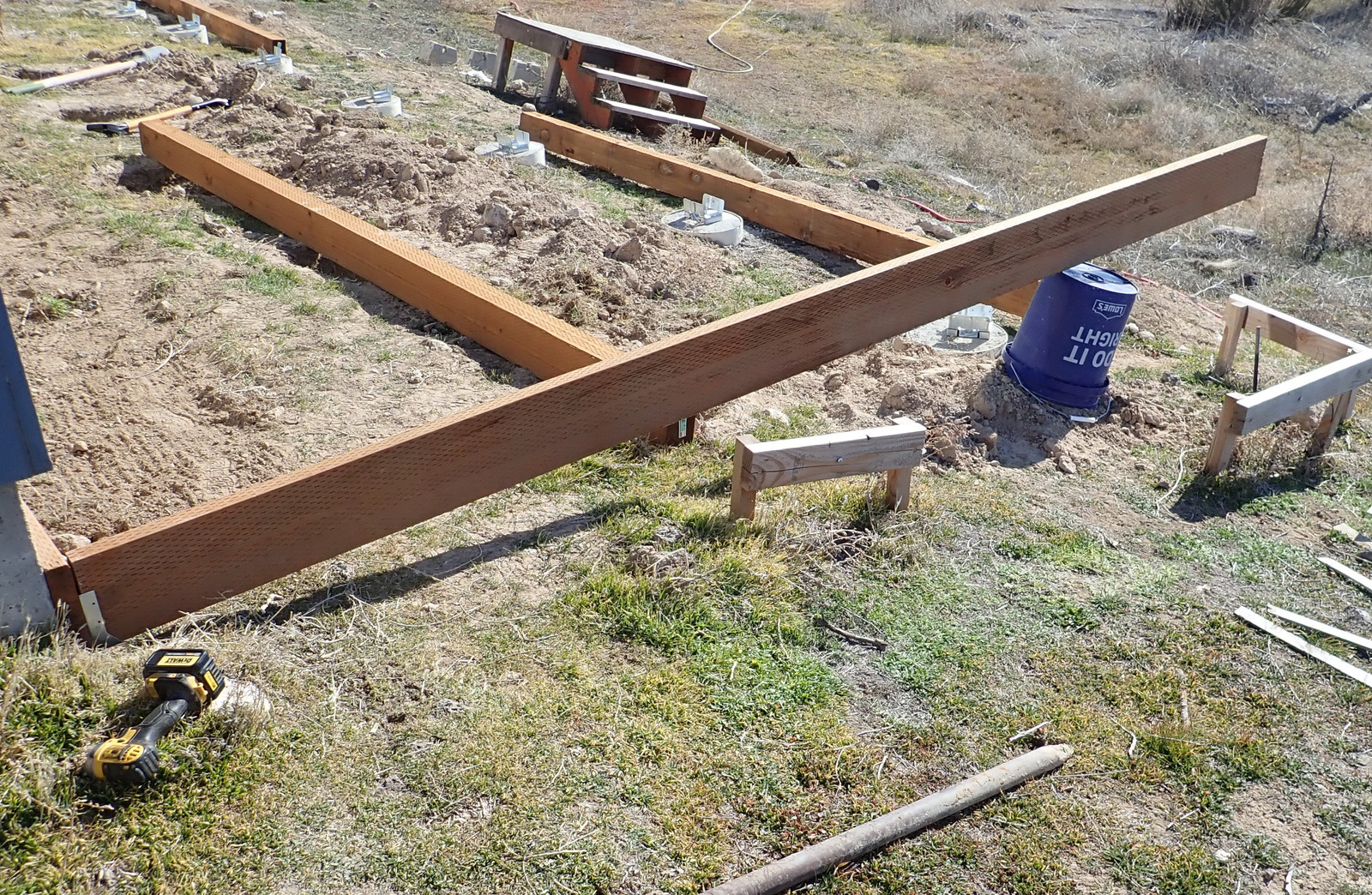 Cut some posts, temporarily align things, add a few more joists to get the spacing, and I can place the mid-beams to figure out exactly what has to happen to make everything fit properly.