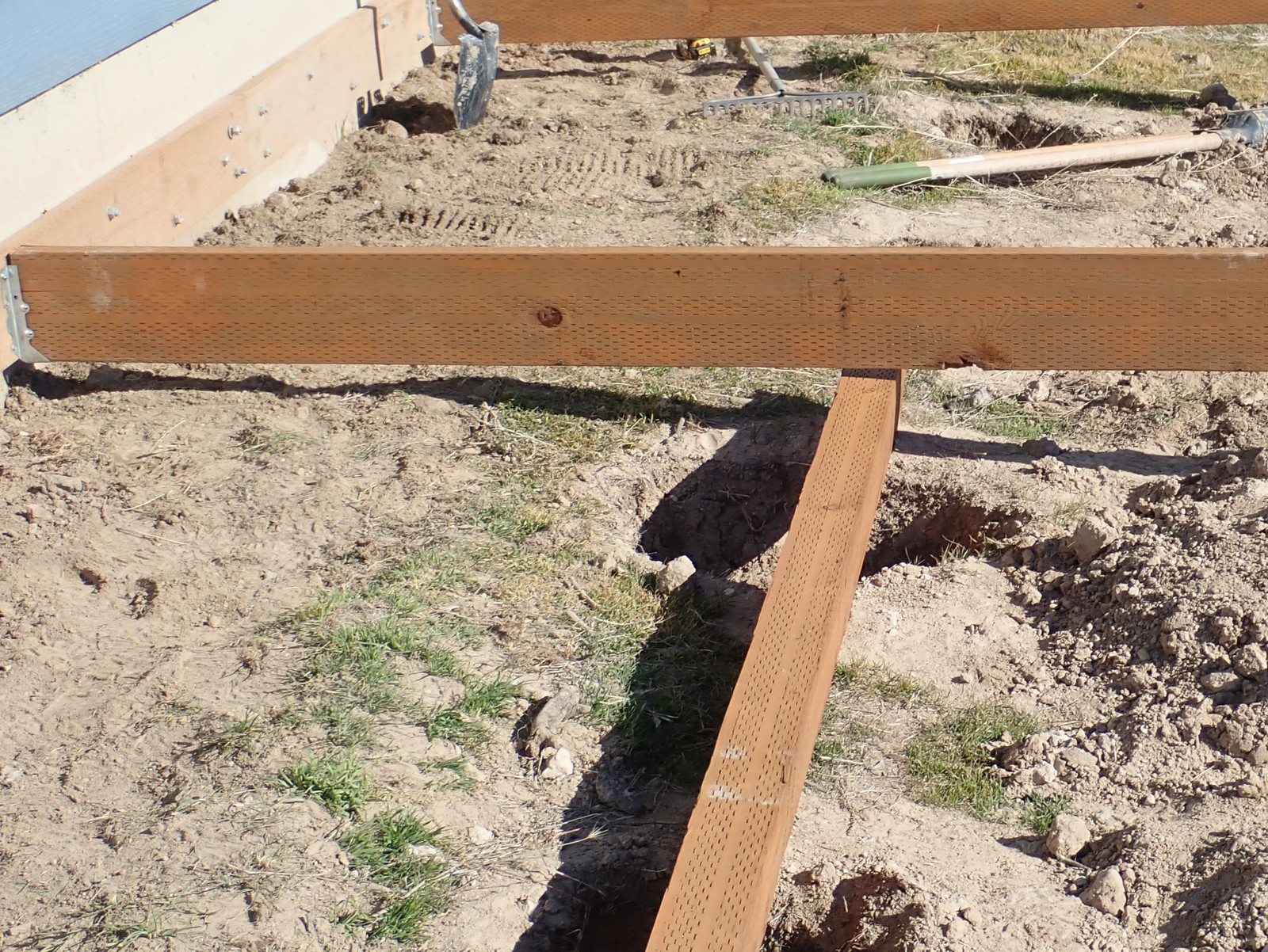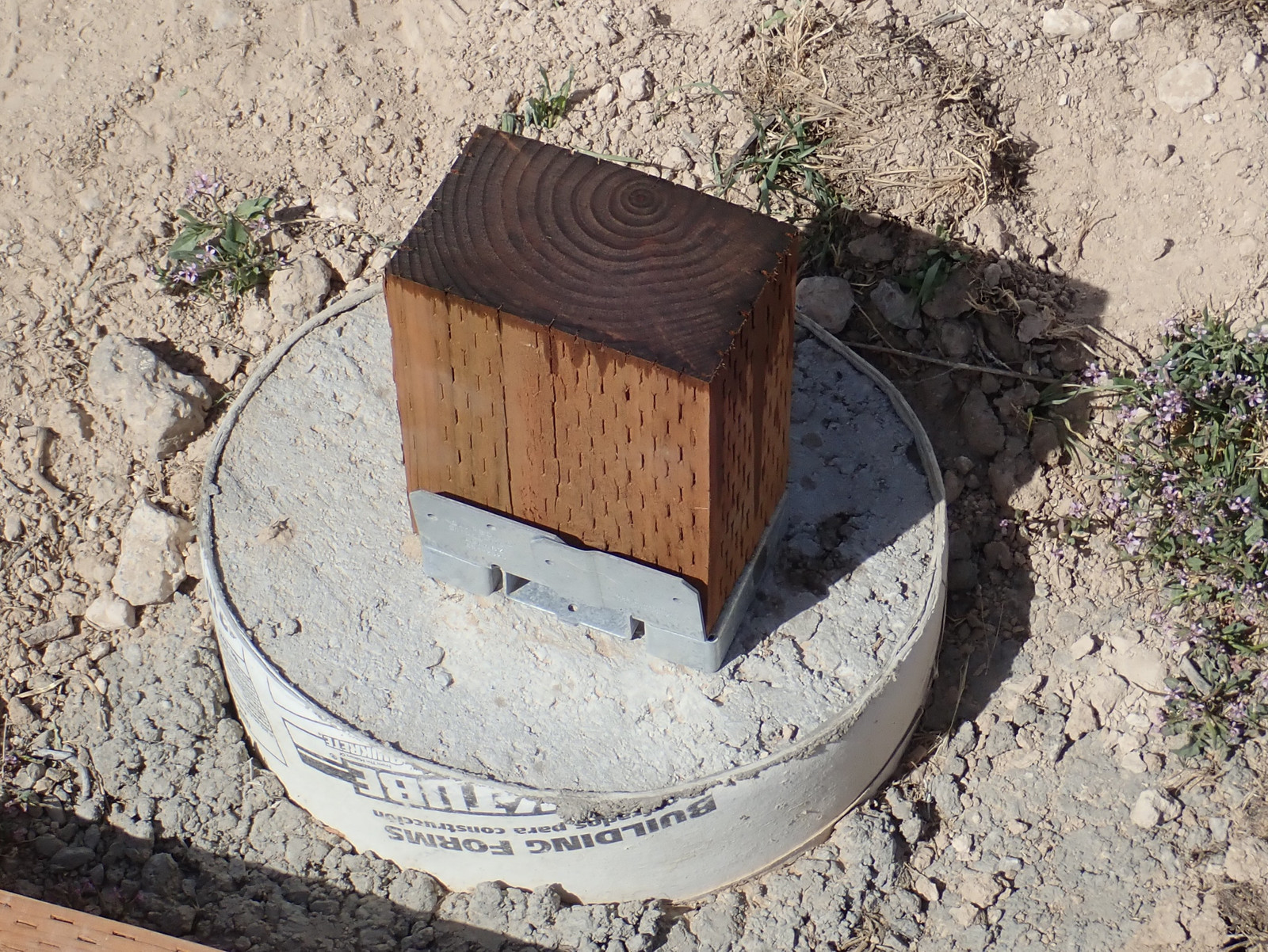 For these holes, since the height of the top mattered a bit more, I did anchor the form tubes in place. A 4” long screw or three, driven through the side of the tube, straight into the dirt, will work very nicely indeed to anchor a tube for concrete pouring! I didn’t have any problems with the tubes shifting during the pour. Because they had to be low to the ground, I wasn’t able to use my normal elevated form holders (squares of 2x4s).