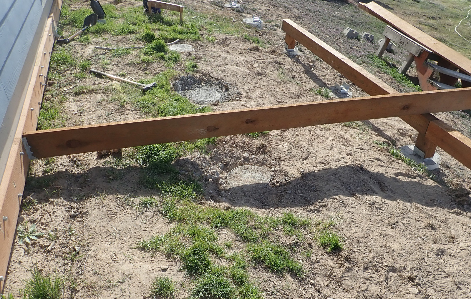 The general concept here is simple enough: Pour concrete, add supports for the beam. I dug down so the beam would clear the holes, worked out heights for the supports (which you’ll see a bit later), and got ready to do yet more concrete pouring.