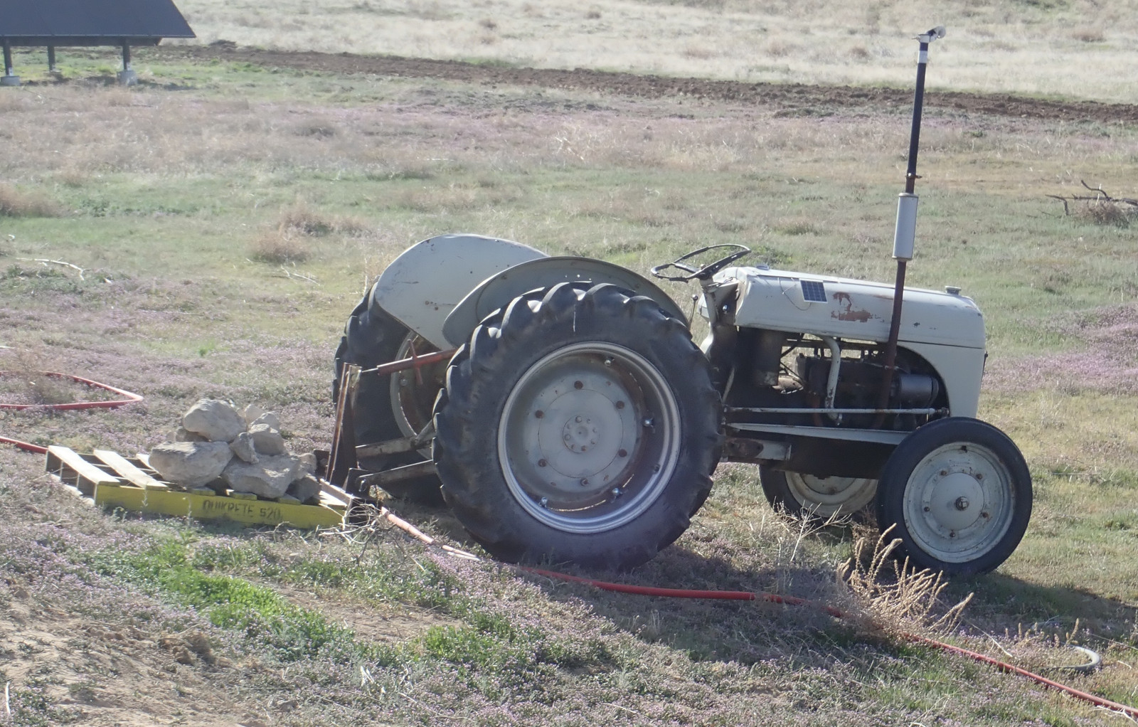 Like any project on our hill, “putting holes in the ground” means “removing rocks from the ground.” This is no exception, and the tractor, complete with new tires, does a wonderful job of moving rocks around the hill. With the pallet jacks on the back and a random pallet (this one is from one of the loads of concrete), the rocks can be rolled on easily, even if they’re too large to lift - though nothing here was quite that large. I collect all the rocks I remove over on a corner of the property for later use - and the pile is getting rather impressive!