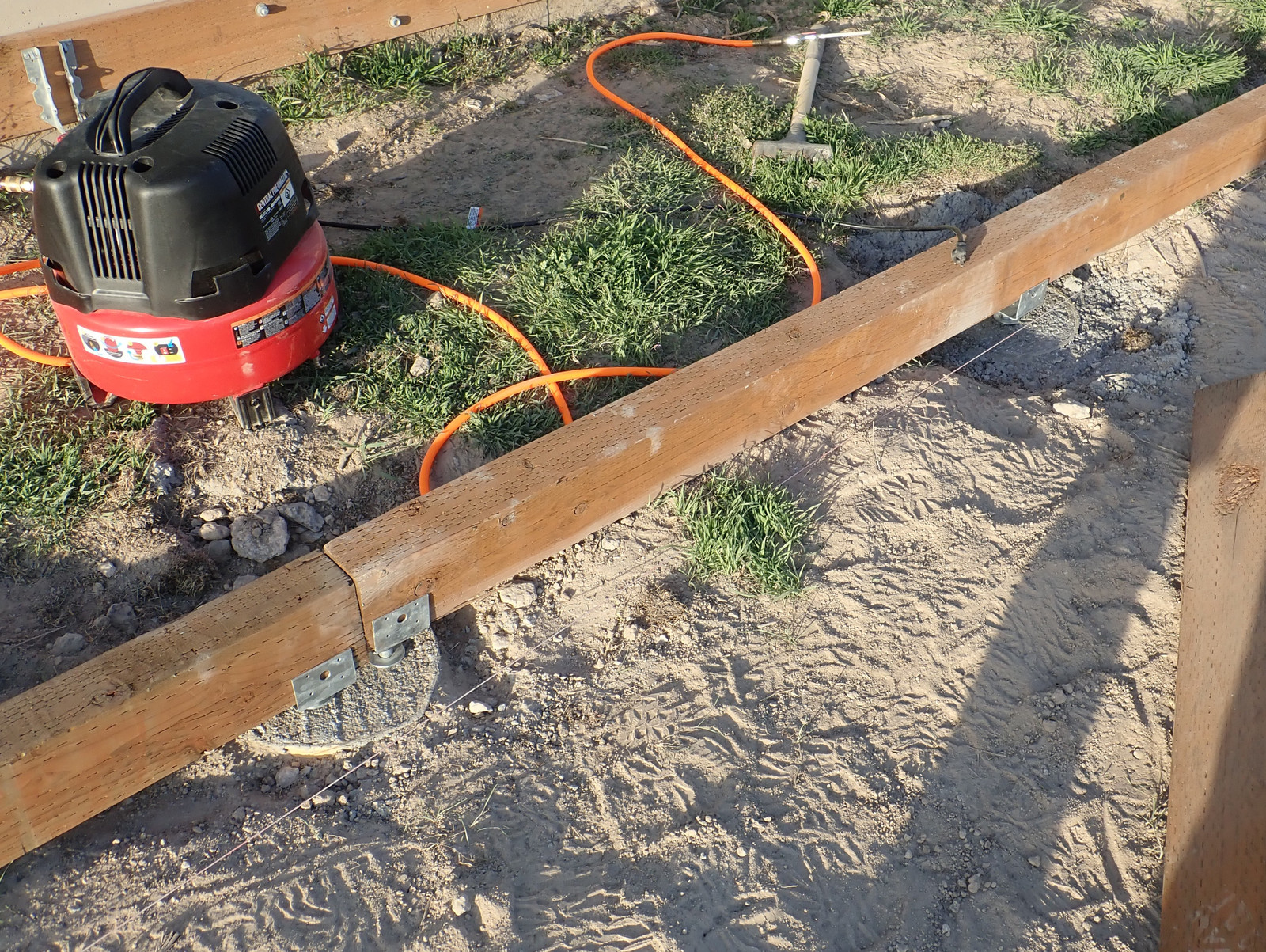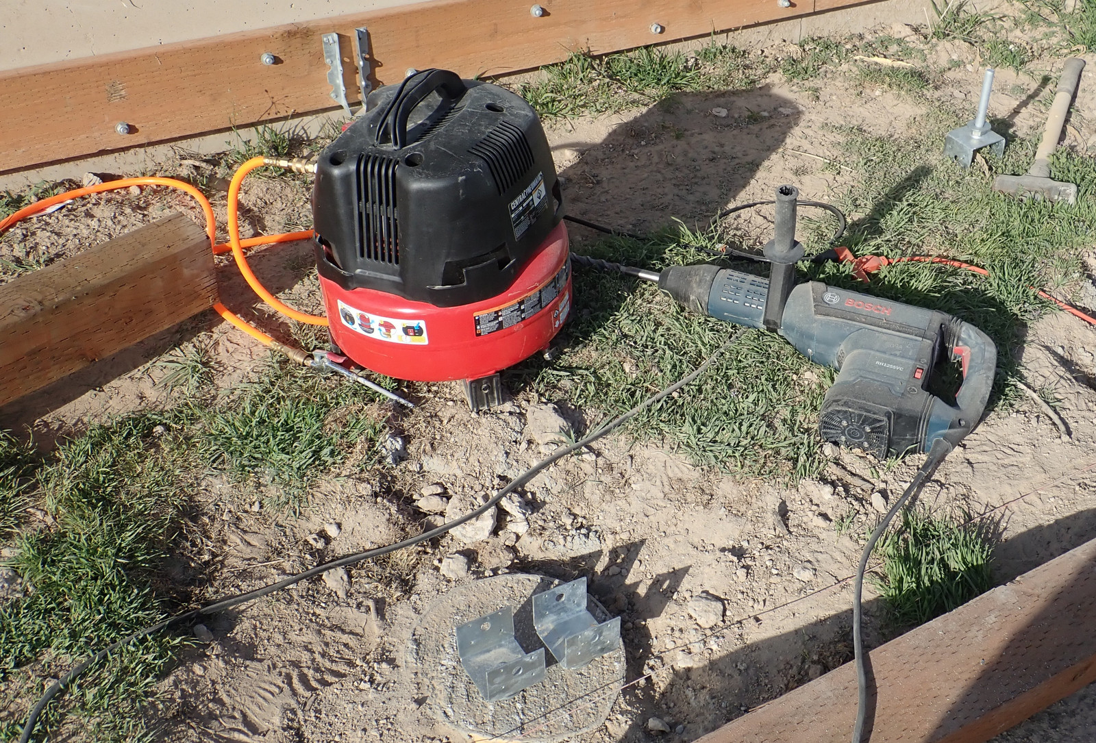 Once the concrete had cured for a week, I brought out the usual set of tools: A rented hammer drill, and my air compressor. Bore a hole, blow it out. Repeat until done. At this point, I really should probably just buy a hammer drill…