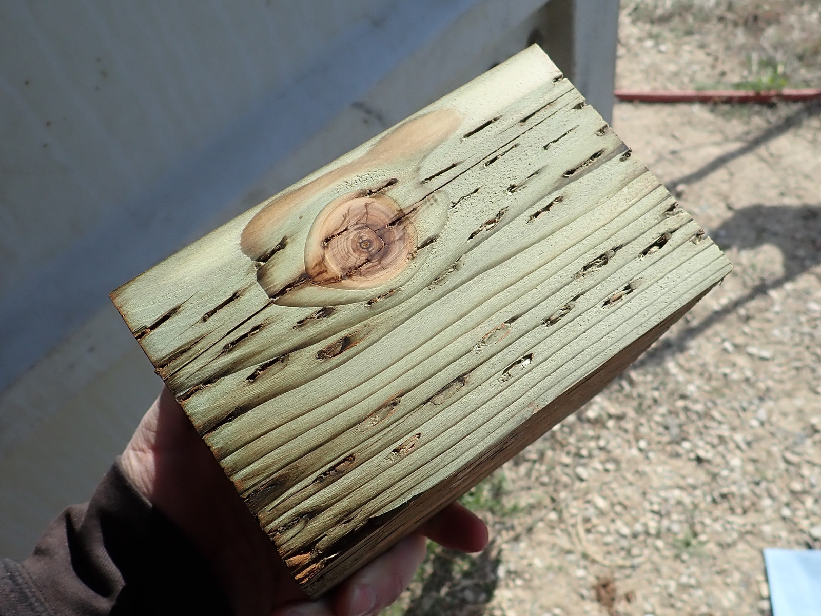 After shaving a bit, the wood still has the pressure treatment slits, and can see sort of how the stuff soaked in - the top stretch is harder wood, and the preservative didn’t soak in as deeply. I’ve never shaved the edge off pressure treated before - it leads to some visually interesting results!