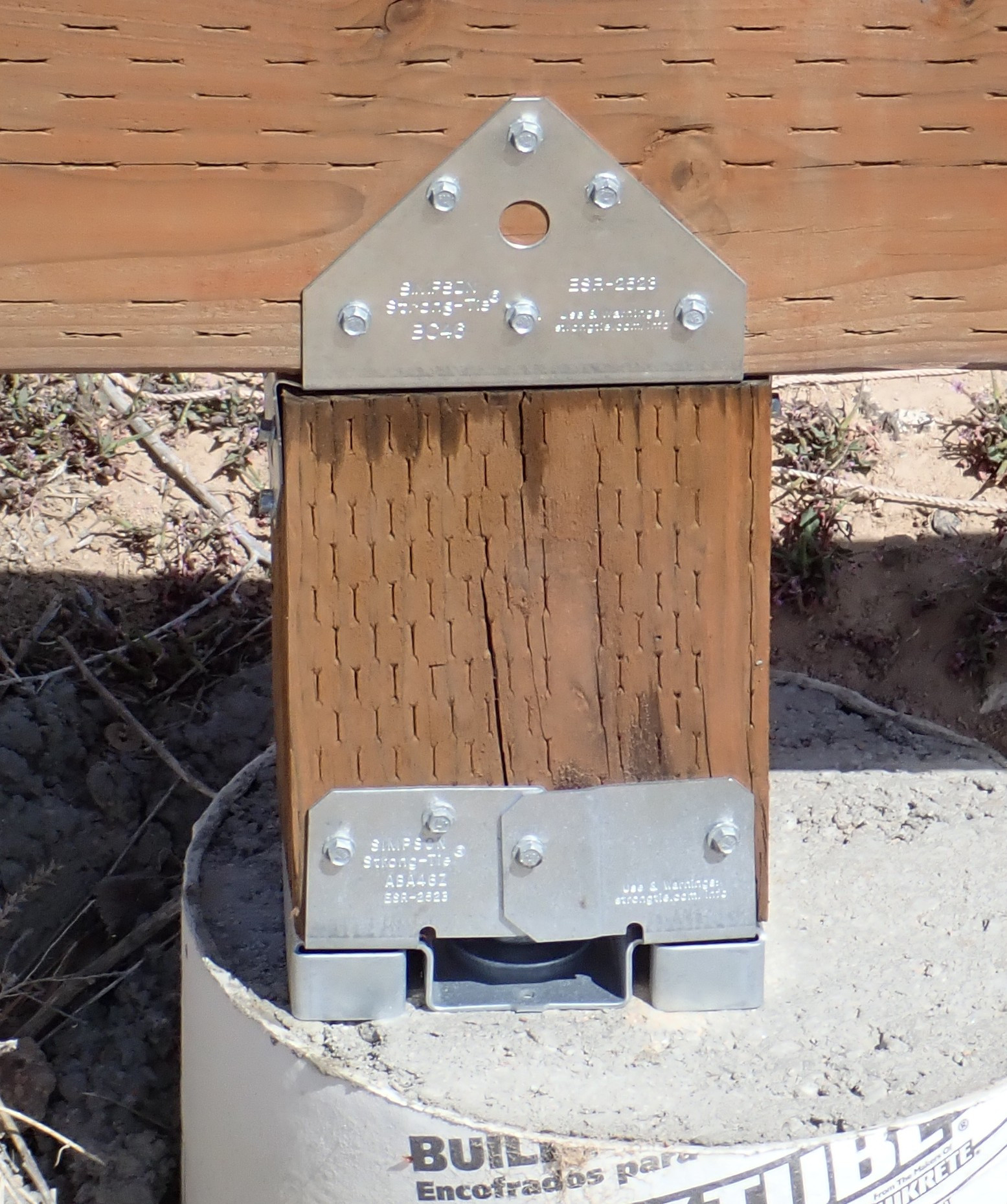 The posts are held down, and the beam brackets are held on, with a large number of screws that are sold by the same company (Simpson), and are designed for this sort of thing (they’re structural screws). Often, stuff like this is held together with nails, and I just hate driving that many nails. I also lack a good nail gun. So, screws it is. You can see the wood preservative on this piece of wood, having soaked in and through it. These will be well hidden under the deck, so I don’t care that they look a bit weird.