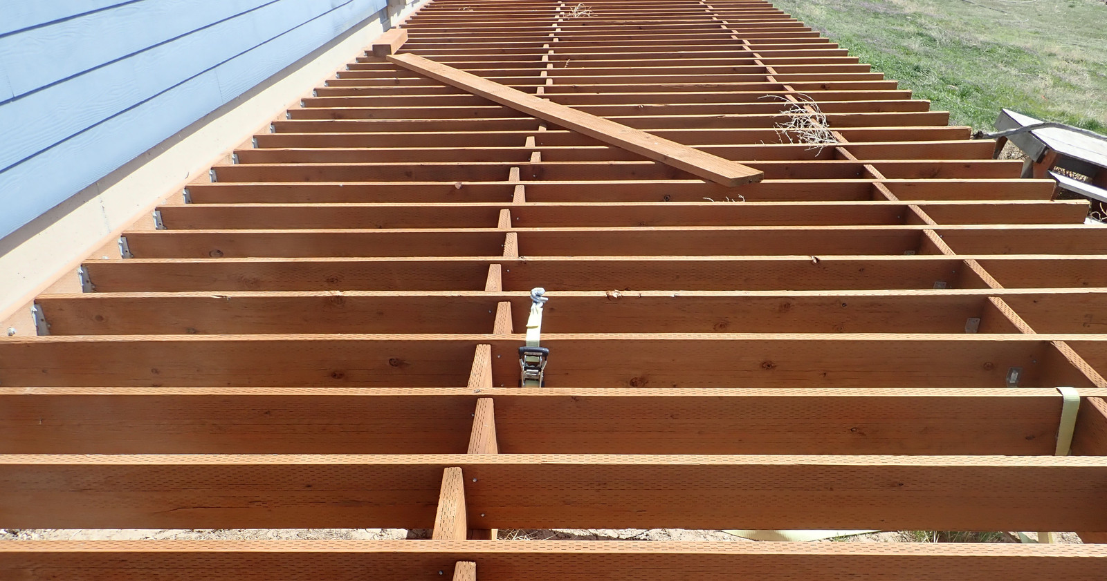 It eventually ends up looking something like this - after a lot of joists and blocker boards. I’ve used the wood protectant on all the various cut ends here, which involved a lot of letting things sit, standing upright, in paint trays. If some boards are being obstinately twisted and need pulled back into shape, a selection of clamps and ratchet straps goes a long ways - apply as needed. You can get a lot of force on big ratchet straps, and once the boards are secured at a few points, they’ll relax over time into the desired shape.