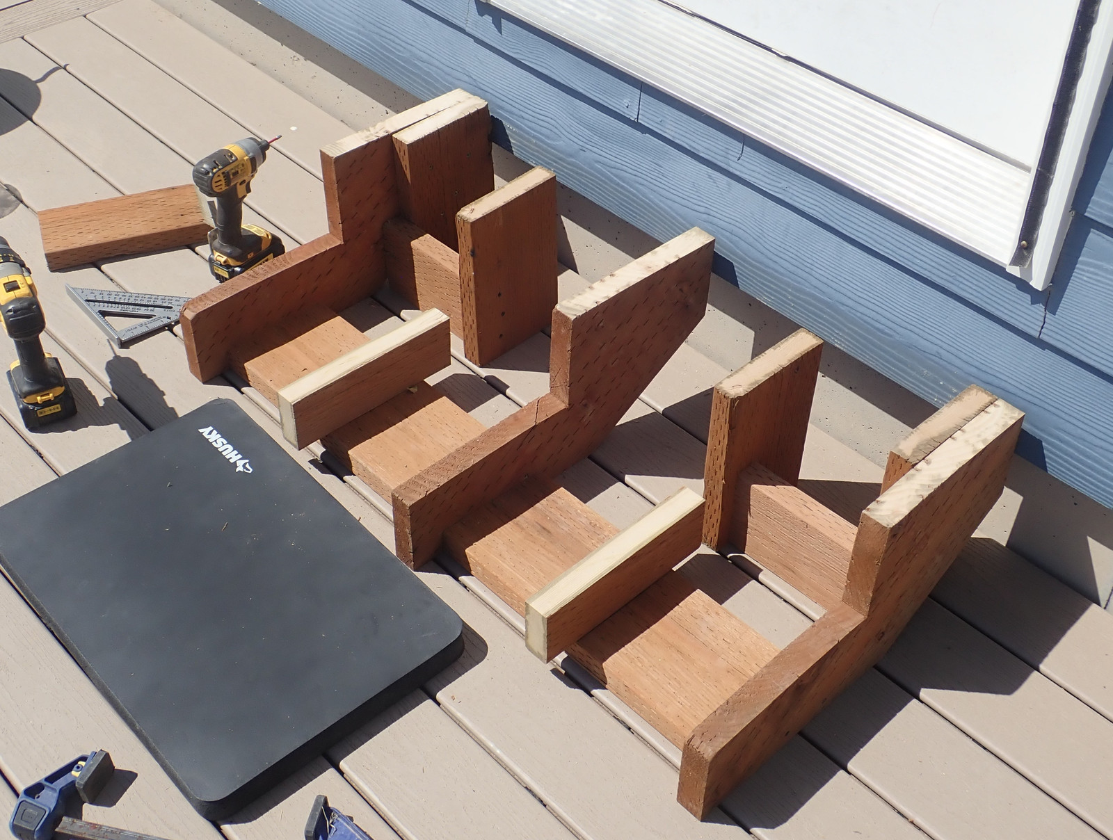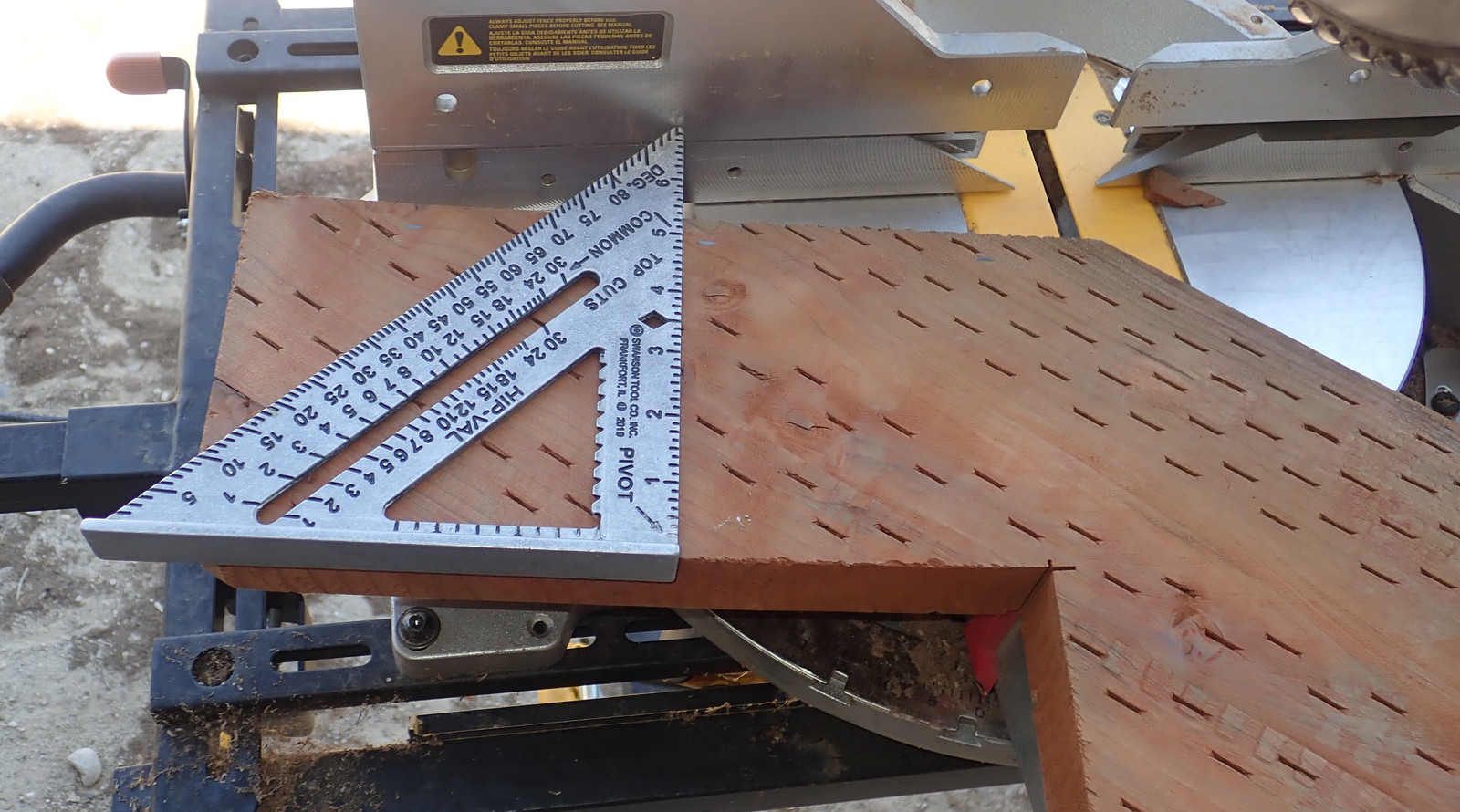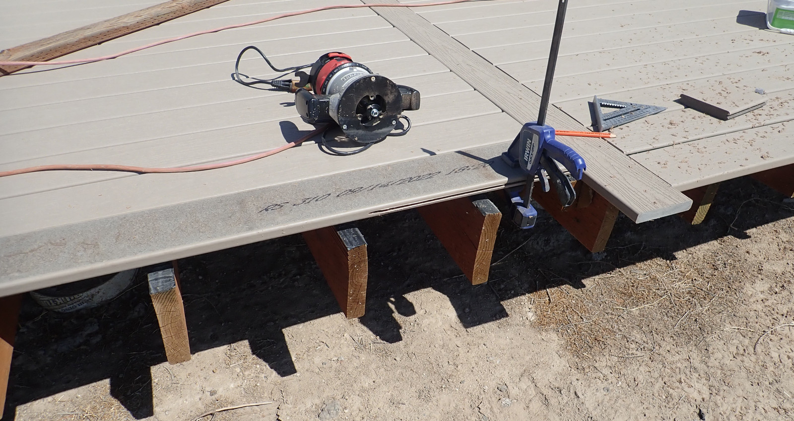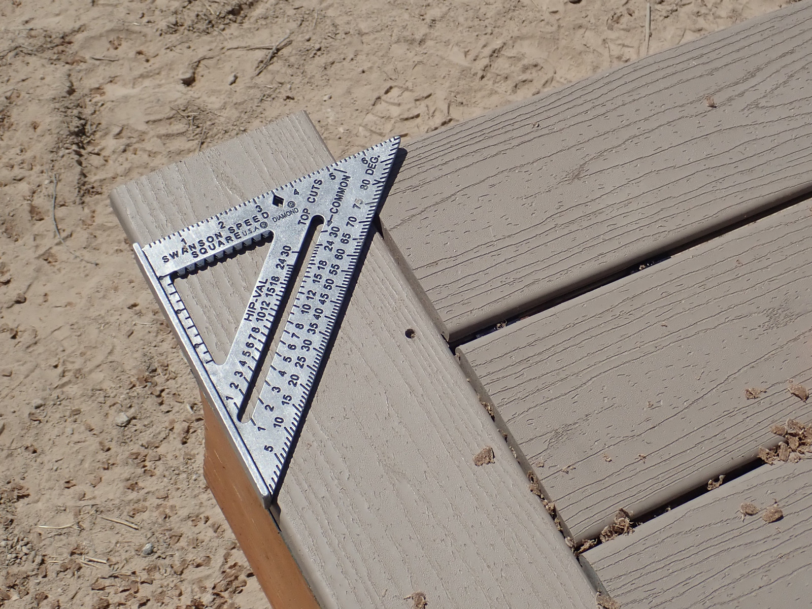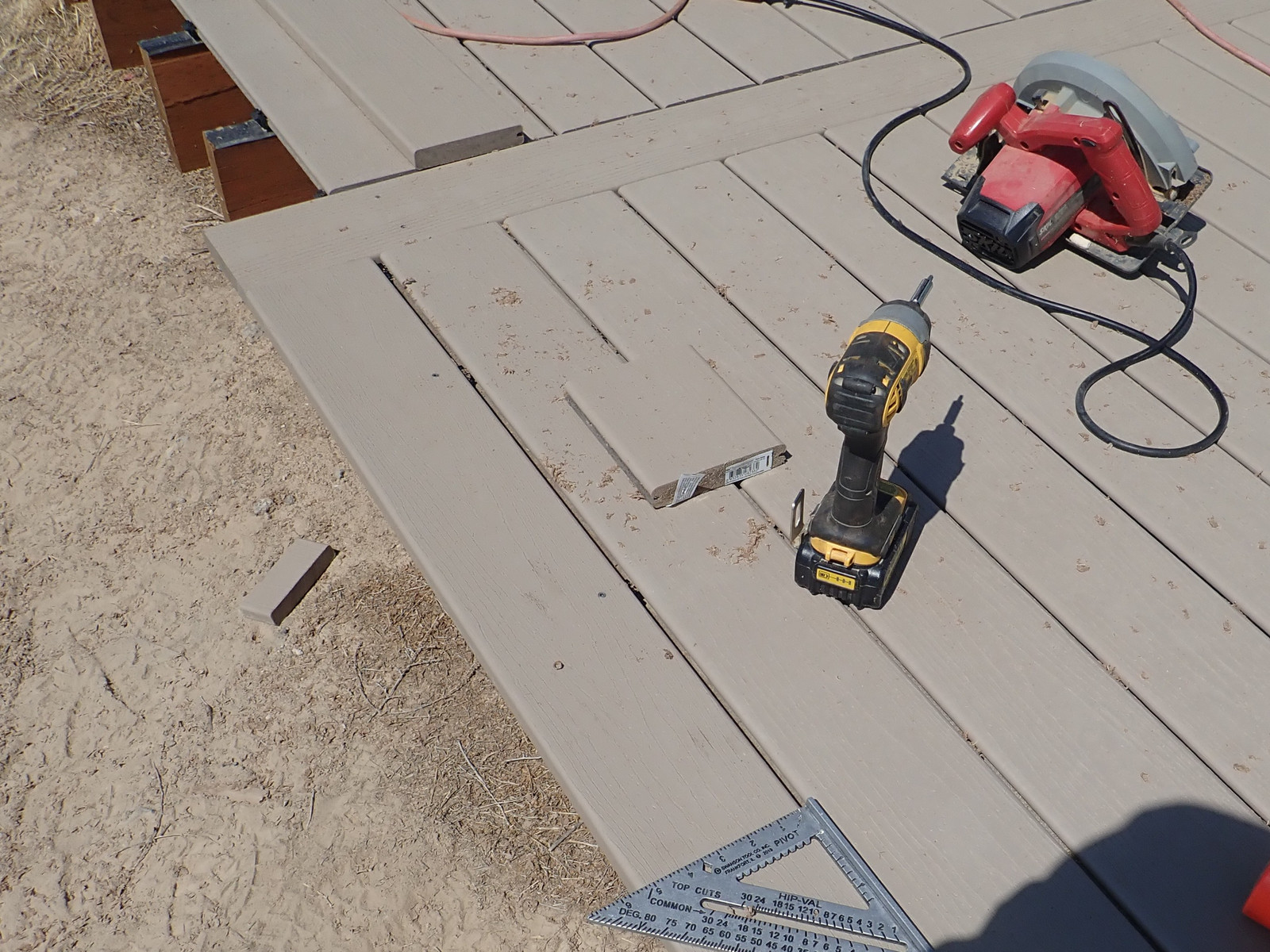 When cutting stair stringers down to size, recall the height of the treads you’re about to put on them - the Trex I’m using is an inch thick. Take that into account when trimming things off! I have to say, I’m quite happy with this metal speed square - my orange plastic one shattered some while back, and this one just keeps going. Caution: Hot in the sun!