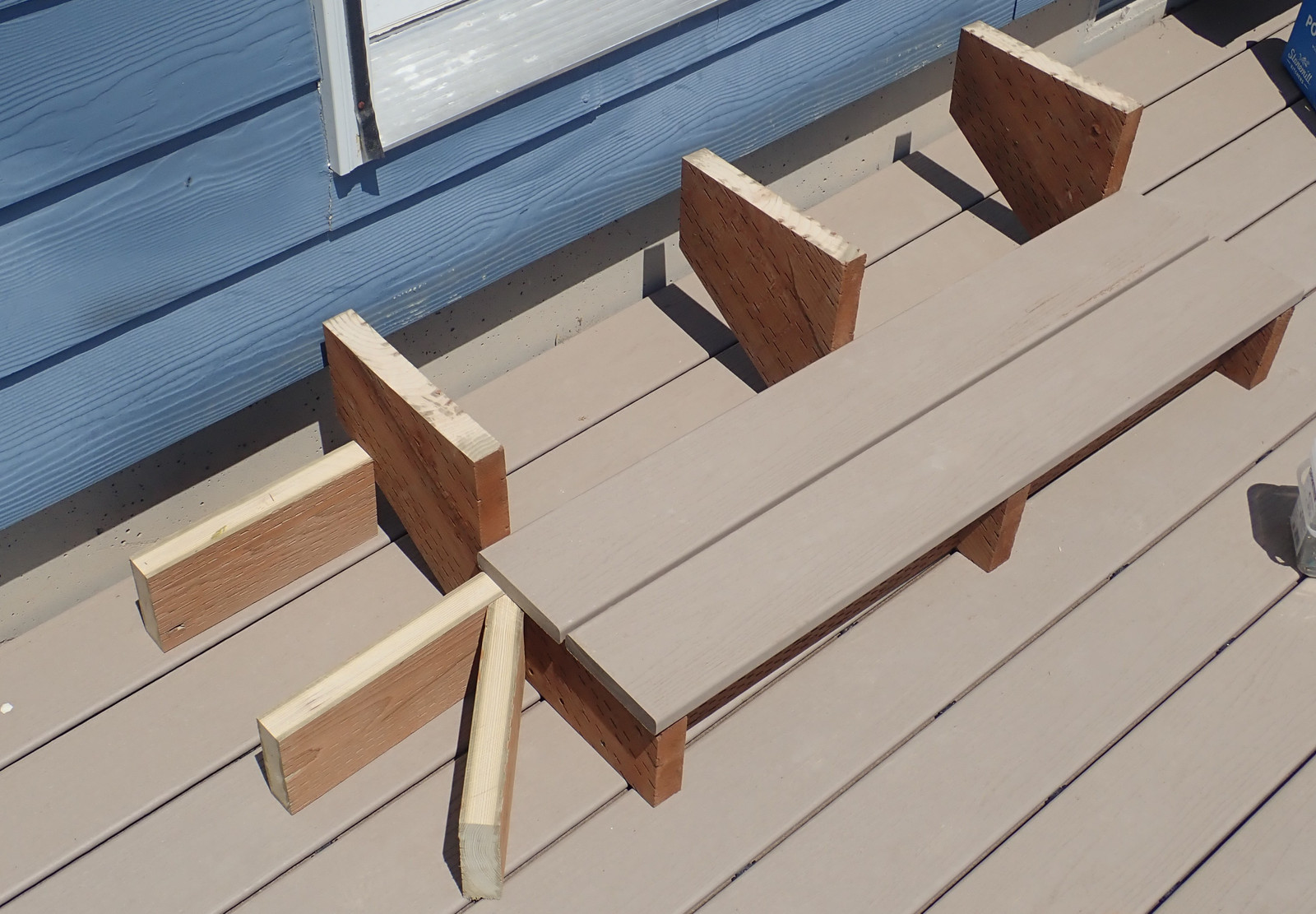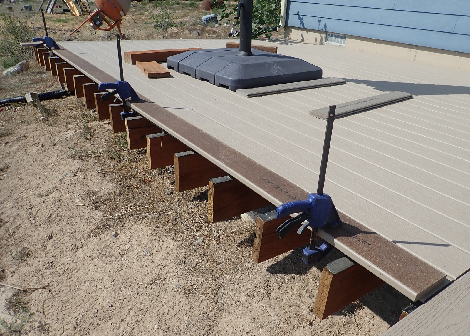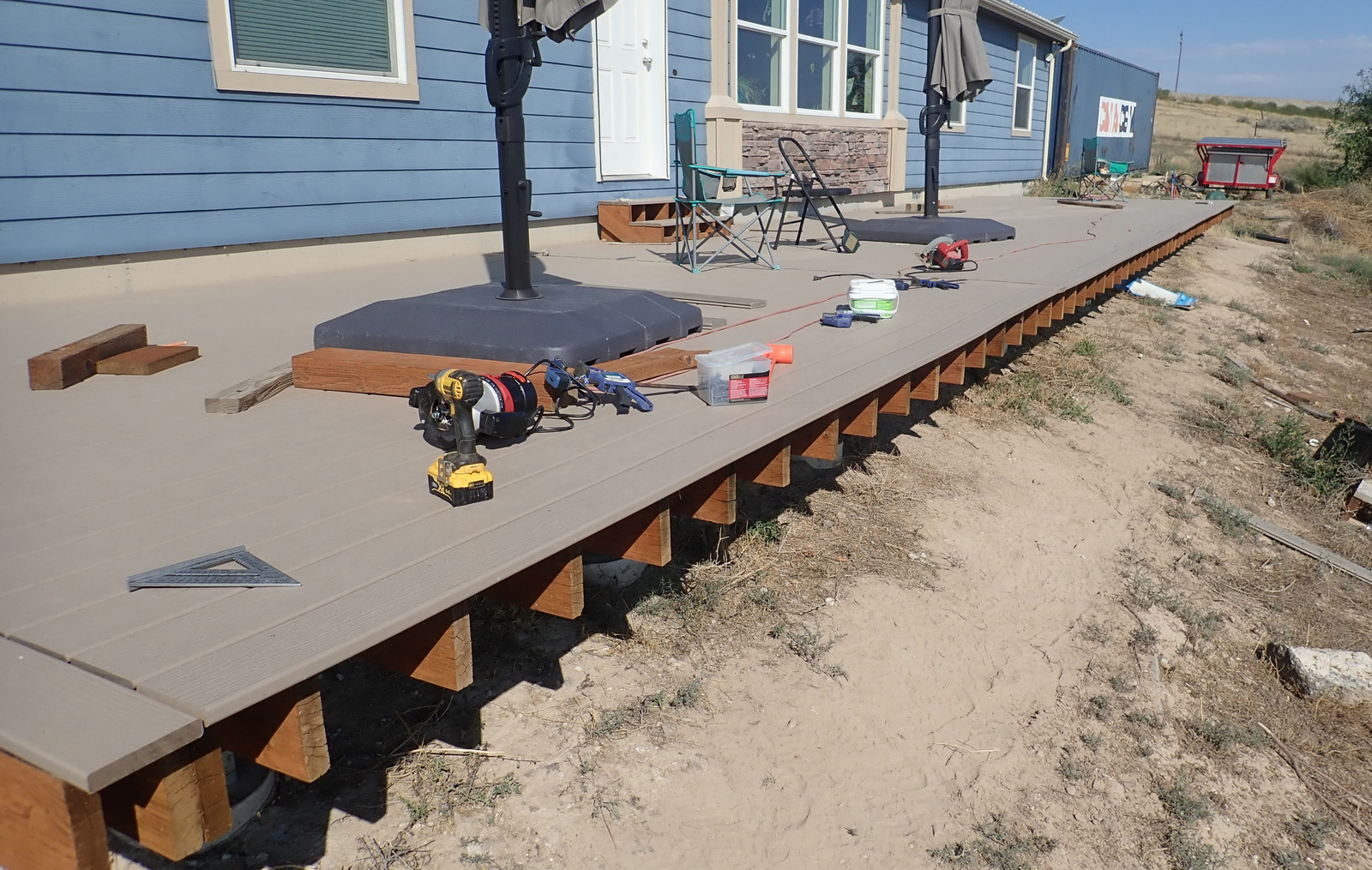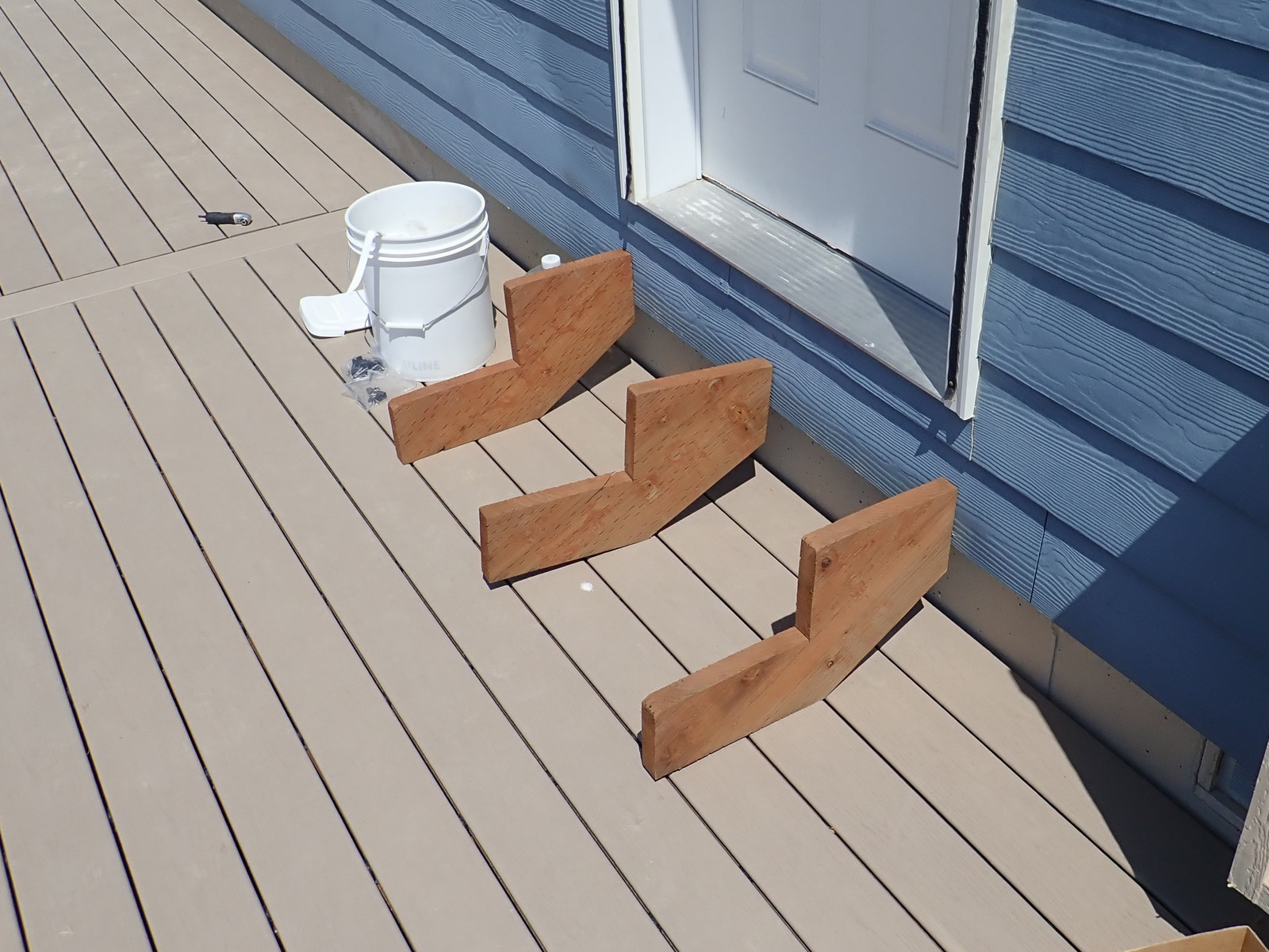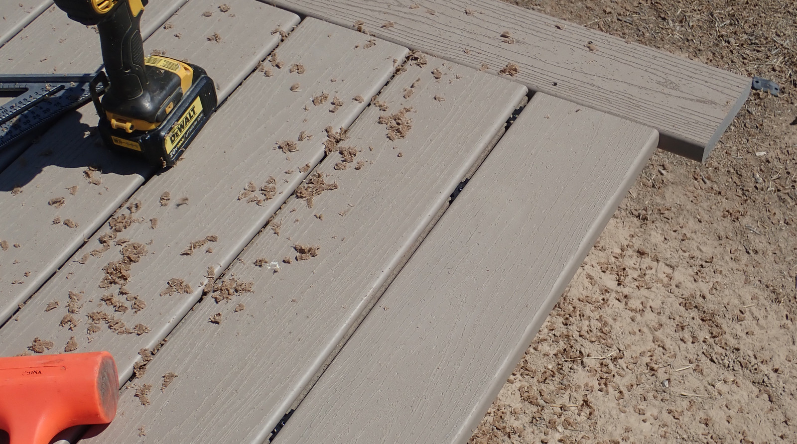 When cutting stair stringers down to size, recall the height of the treads you’re about to put on them - the Trex I’m using is an inch thick. Take that into account when trimming things off! I have to say, I’m quite happy with this metal speed square - my orange plastic one shattered some while back, and this one just keeps going. Caution: Hot in the sun!