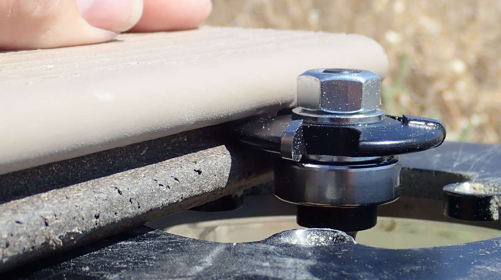 As of the last update, I had the bulk of the Trex in place with hidden fasteners - though I’m suffering some tennis elbow as a result of all the hammering and need to get that resolved. The last step in a “full deck” is to finish it out with the square edged Trex (the stuff I built the stairs out of). There are two ways of doing this - either secure the outside of the previous “hidden fastener” board with screws and fully screw the final board in entirely, or do what I did, get a Trex Hidden Fastener router bit, and make one of the square-edge board edges compatible with the hidden fasteners - and then screw the outside of that in. Benefits include “Cleaner, better looking, and only marginally more work.” Of course, you have to borrow a router, if you don’t have one…
