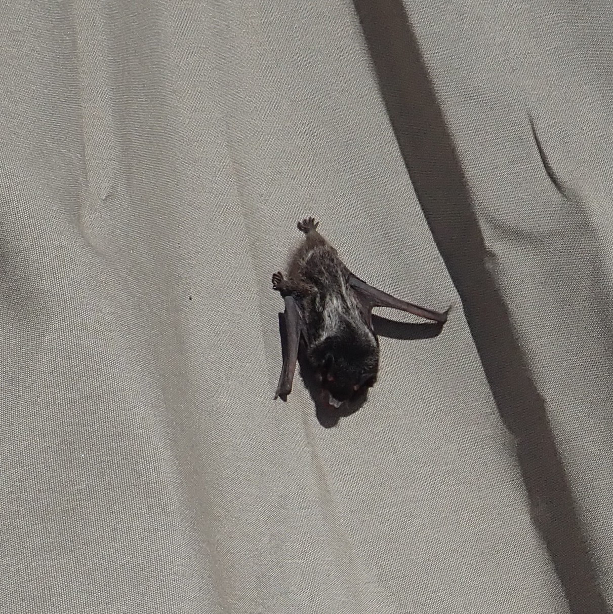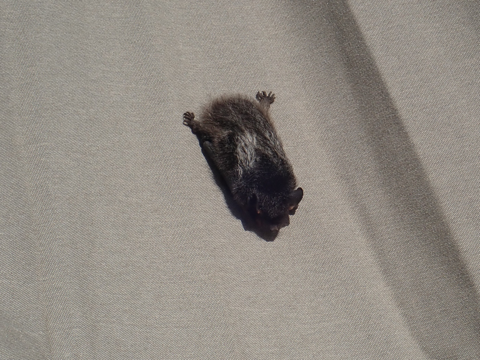 Apparently, though, a stowed umbrella is a compelling seeming place to sleep the day away, if you’re a bat. I went out one afternoon to deploy them, and as I started cranking it up, I saw a large black spot. I was initially annoyed, thinking it was mold or mildew, but… nope! This is what I found!