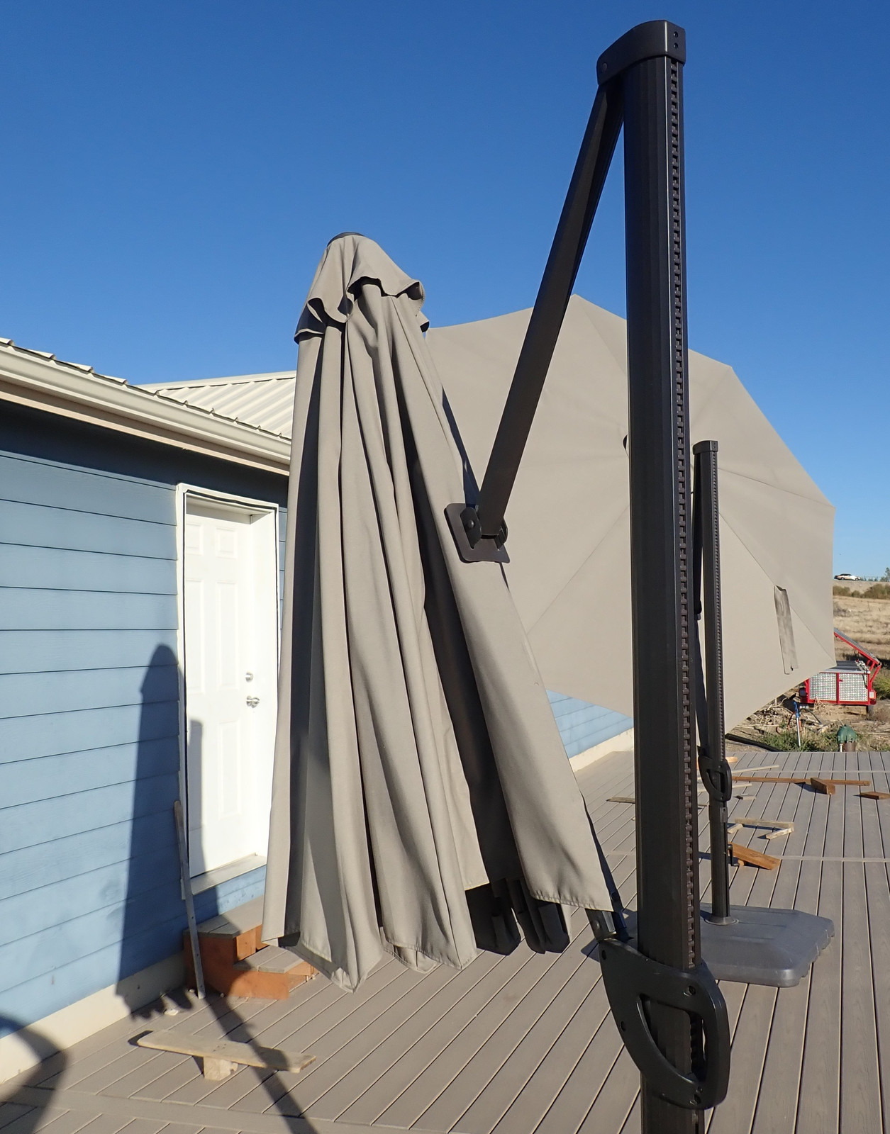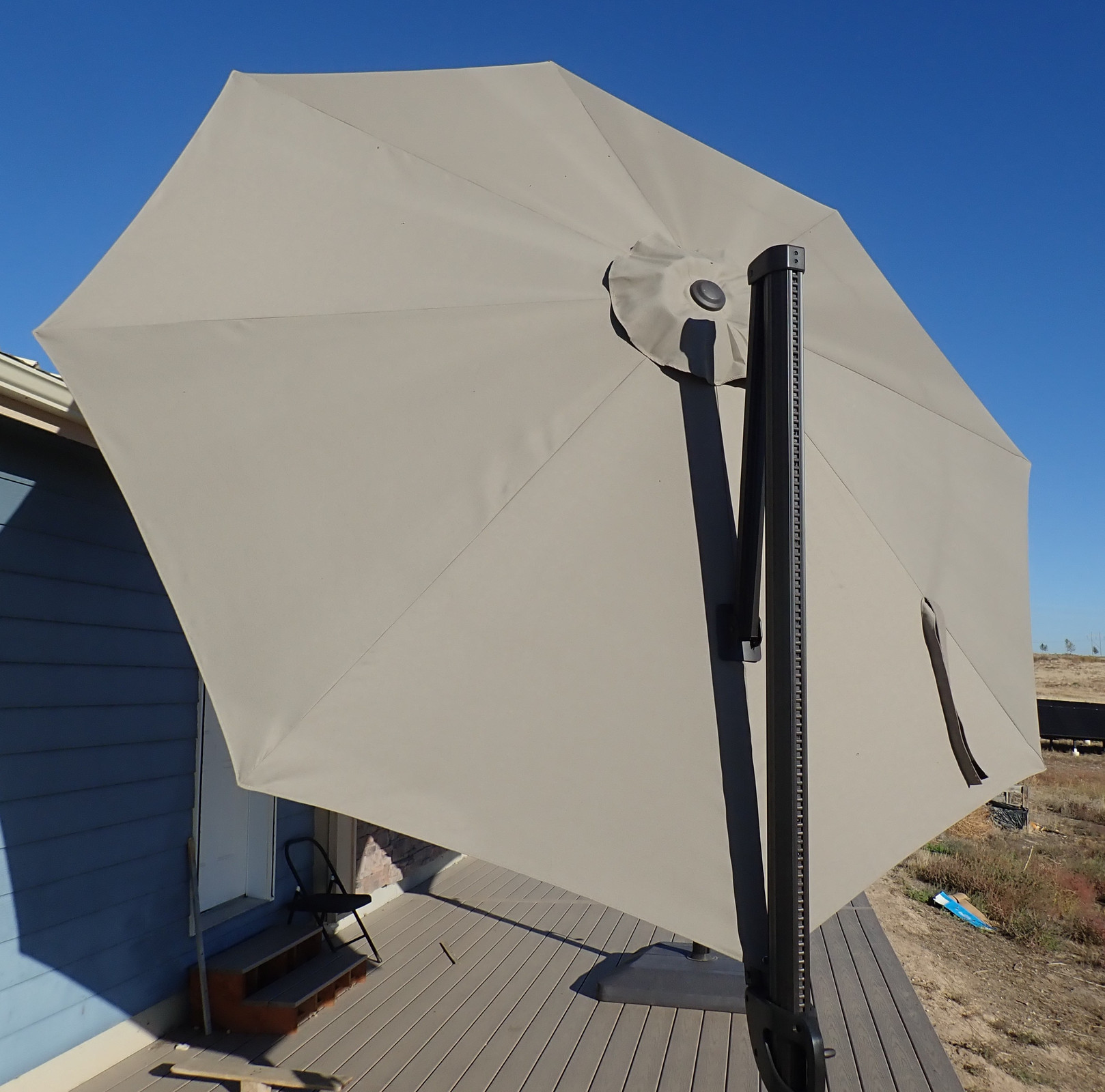 There’s a crank on the handle that pulls on a rope. Crank it a bit, flip all the umbrella ribs out (at least one or two tend to like to be over-center and the umbrella won’t deploy until you fix it), and the umbrella pops out. Presto! Instant shade! Well, at least, during the middle of the day. Towards the evening, when we like it use our deck, the sun is coming from lower in the sky and this doesn’t offer much useful shade. You can see the shaded section across the door.