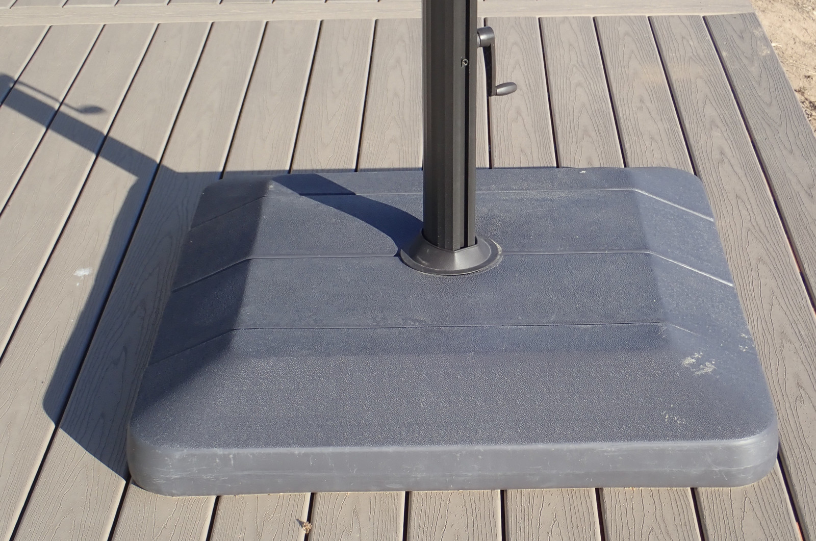 You can fill each of the four base pieces with whatever you want - sand, water, antifreeze, etc. If they’re going to be out all winter long, you probably don’t want to fill them entirely full of water, because it will certainly crack them when it freezes. I went with some play sand, though it’s of the wetter variety and a pain to pack in (you can’t just pour stuff out of the bags in). They’re not entirely full, but there’s enough weight to keep the umbrellas mostly planted when deployed. Wind can still push them around a bit, so be careful - Trex provides a slippery enough surface for other plastics that these can be slid around by either a person or the wind.