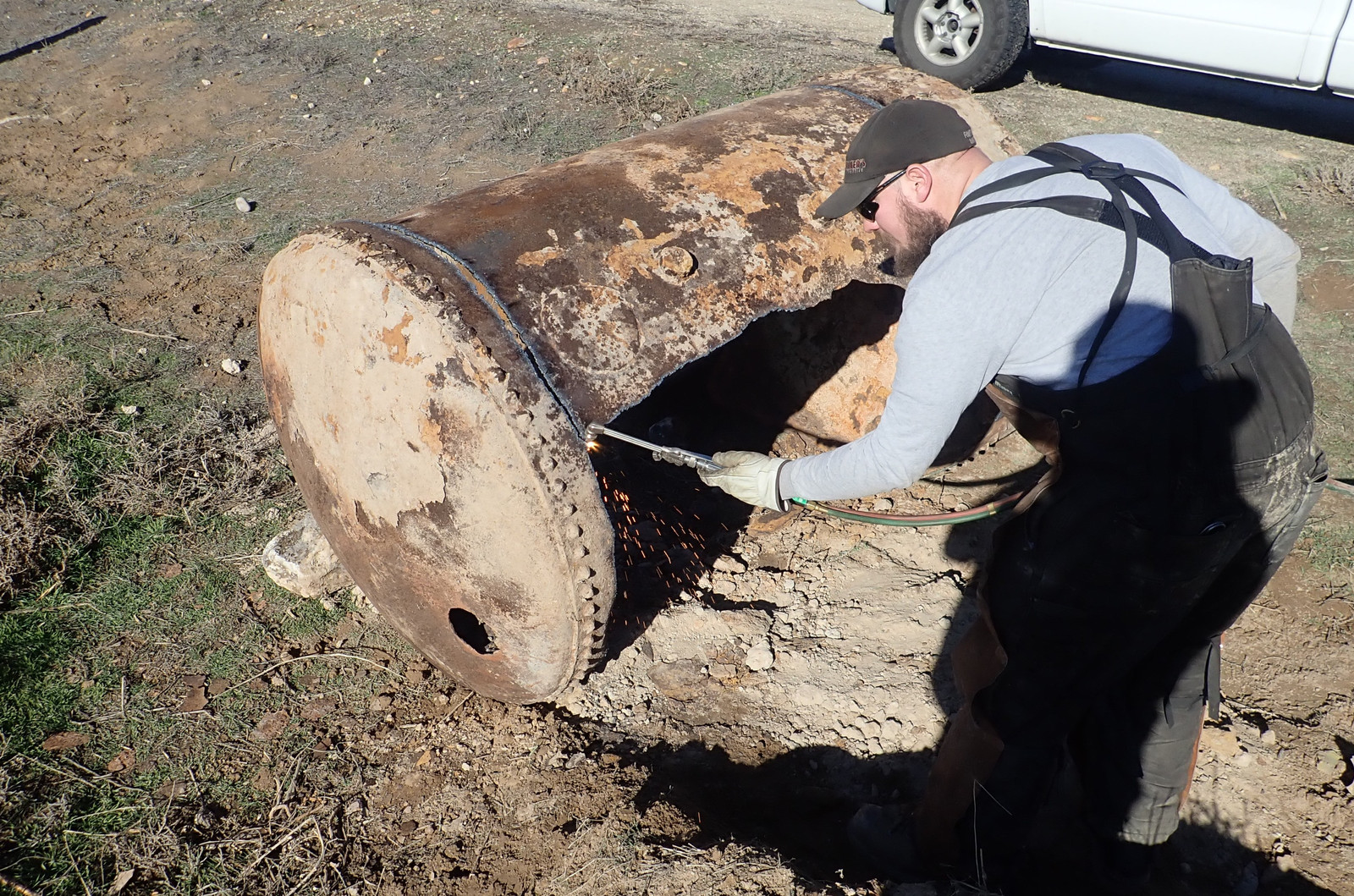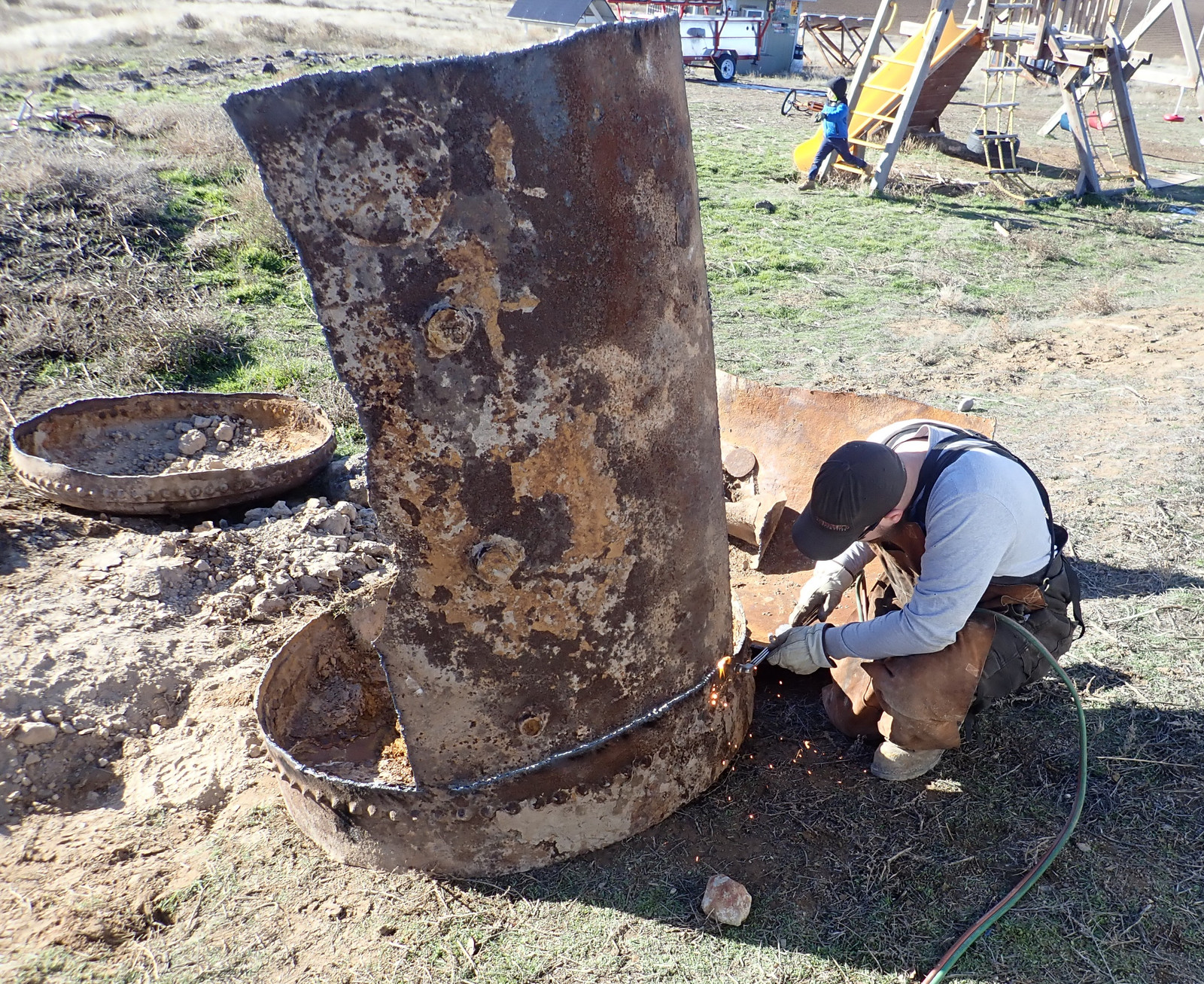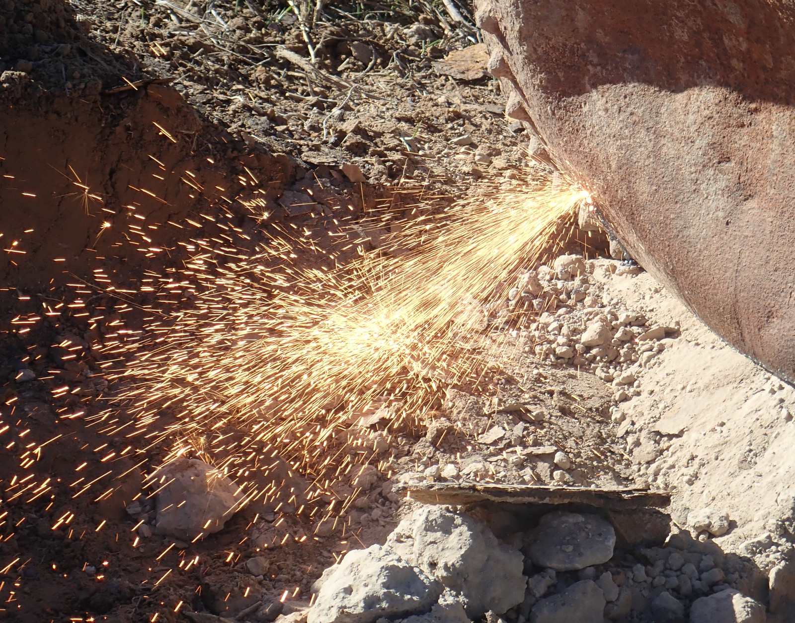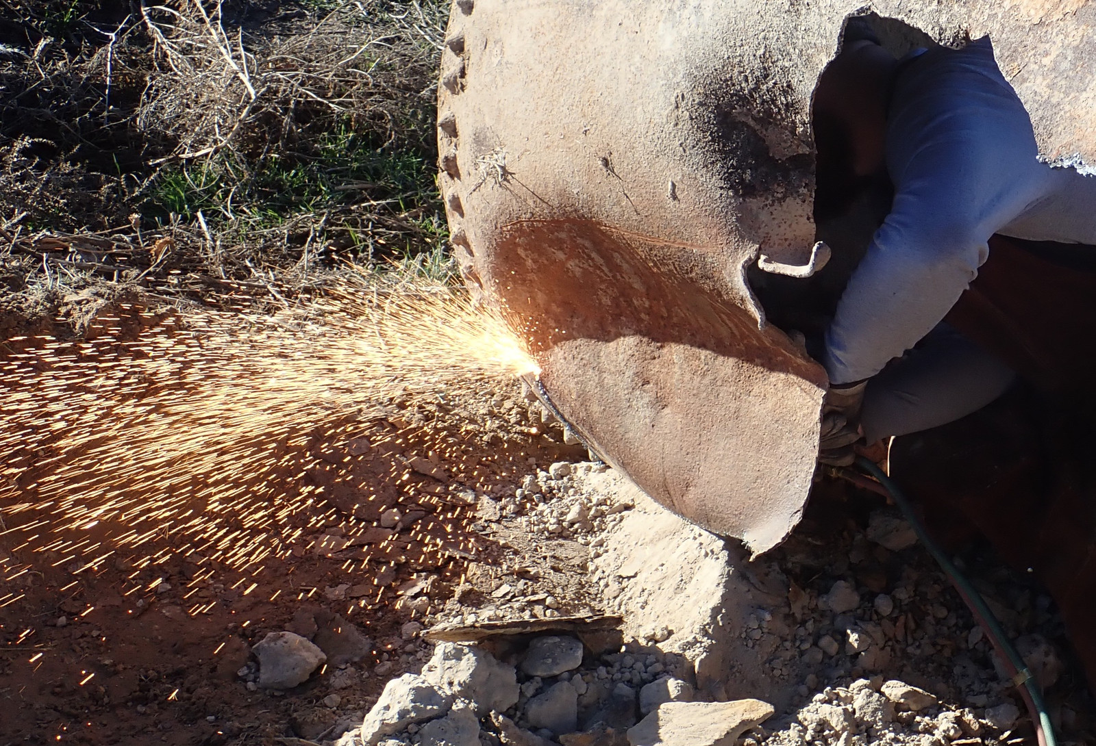 Cutting torches and grinders: Two good ways to light hills on fire. This sort of thing is why I waited until the hill was very wet to have someone come torch the tank apart. A cutting torch (at least this style) uses an oxy-acetylene flame to heat the metal up, and then a blast of oxygen to actually do the cutting - it burns the metal and clears the molten bits, and I understand that if you’re good and the metal is agreeable (this metal was assuredly not), you can turn off the acetylene after the cut is started and just run pure oxygen for the duration.