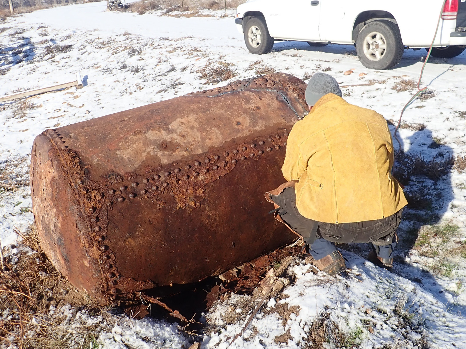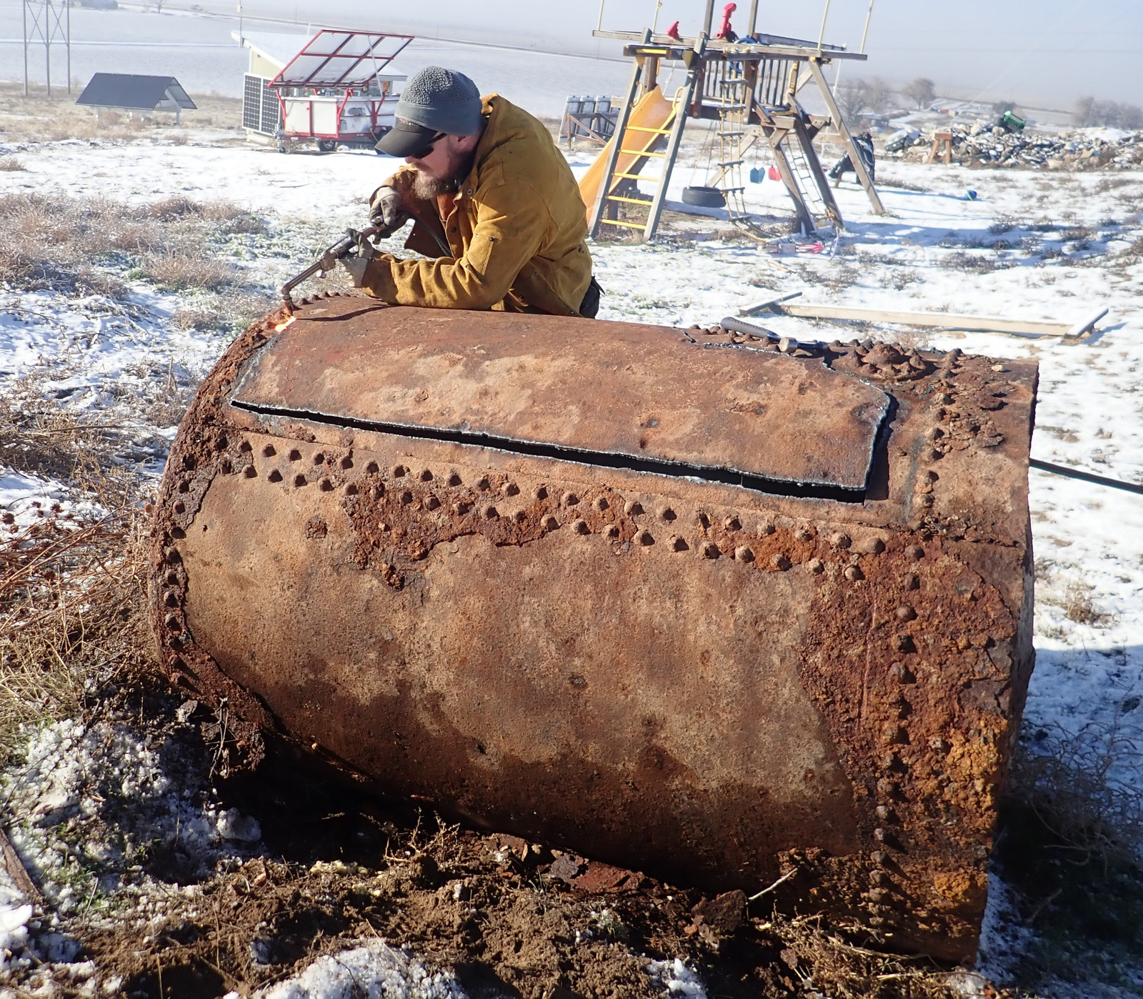 There’s also the problem of “Not lighting our hill on fire.” There have been times when people were free to help cut the tank up, but it was “windy and dry” - and while I have some good hoses, I would still like to avoid “making the list” of people who’ve lit the hill on fire. Instead, I waited until things were good and wet in the winter - though we got an awful lot more snow after this. The ground was wet, the wind was calm, and Josh was here with a set of tanks strapped into the back of his truck. Time to start carving!