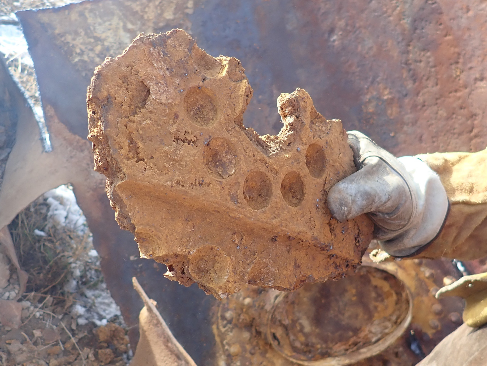 Once the cuts are almost through, you can start bending the metal away and make the final cuts easier. See all that crud on the inside of the metal? That’s what’s making the cutting hard - and this is after driving most of it off with hammers from the outside. We did a solid rendition of the Anvil Chorus while bashing away at it!