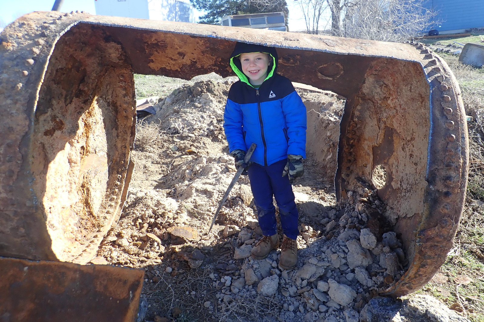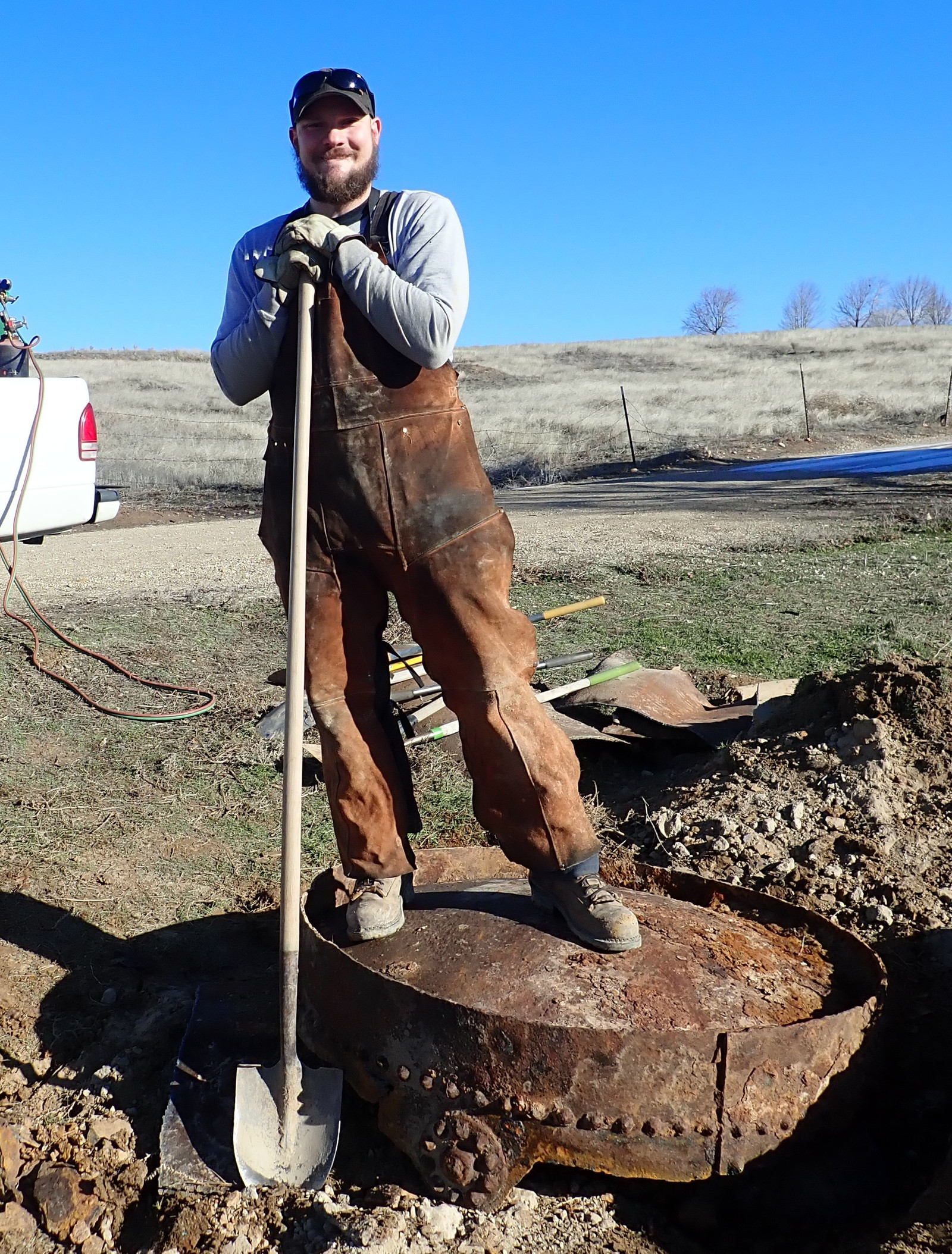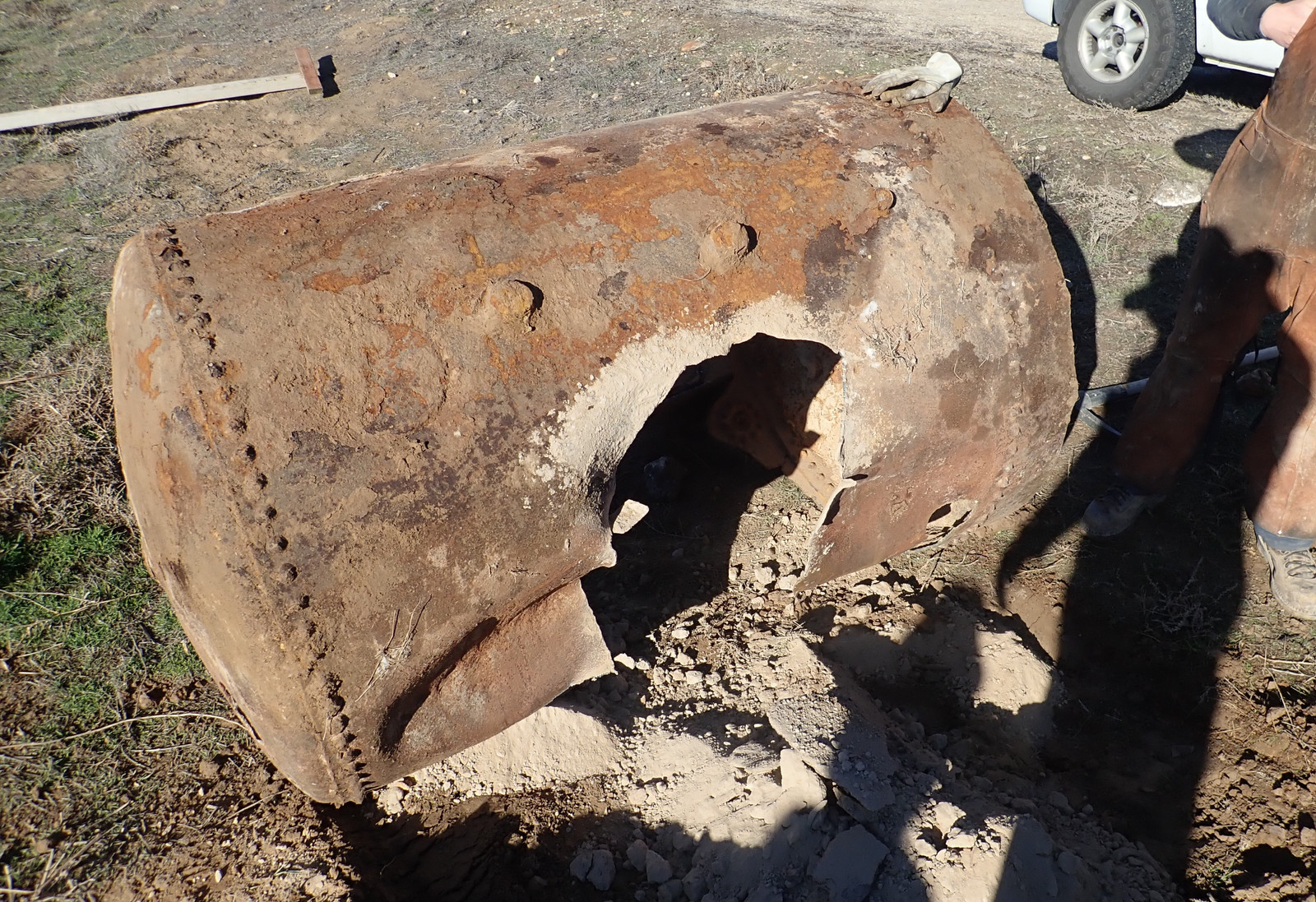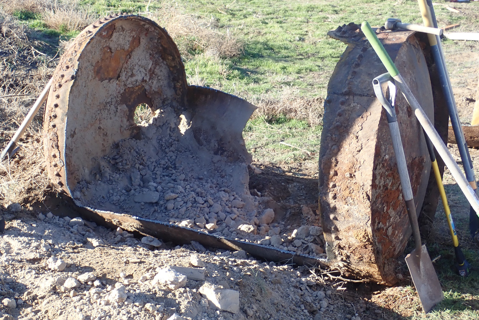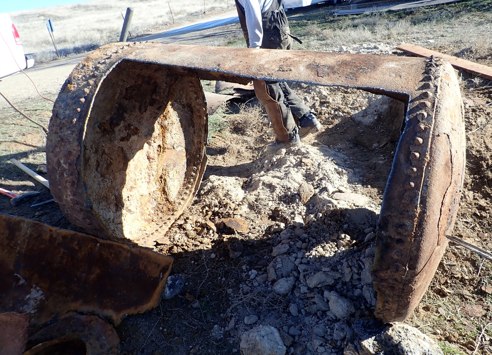 We later had someone else out with a decent sized backhoe (putting in a retaining wall), and they were able to dig the tank up and pull it out of the ground. It was half full of dirt or septic remains or something, and they couldn’t move it further, but it was at least up where it could be worked on - and there it sat for several years, because quite a few people looked at it, and commented about just how awful cutting that thing apart would be. I don’t know my way around a cutting torch, and a rusted, caked up tank of massive thickness didn’t seem a good one to learn on.