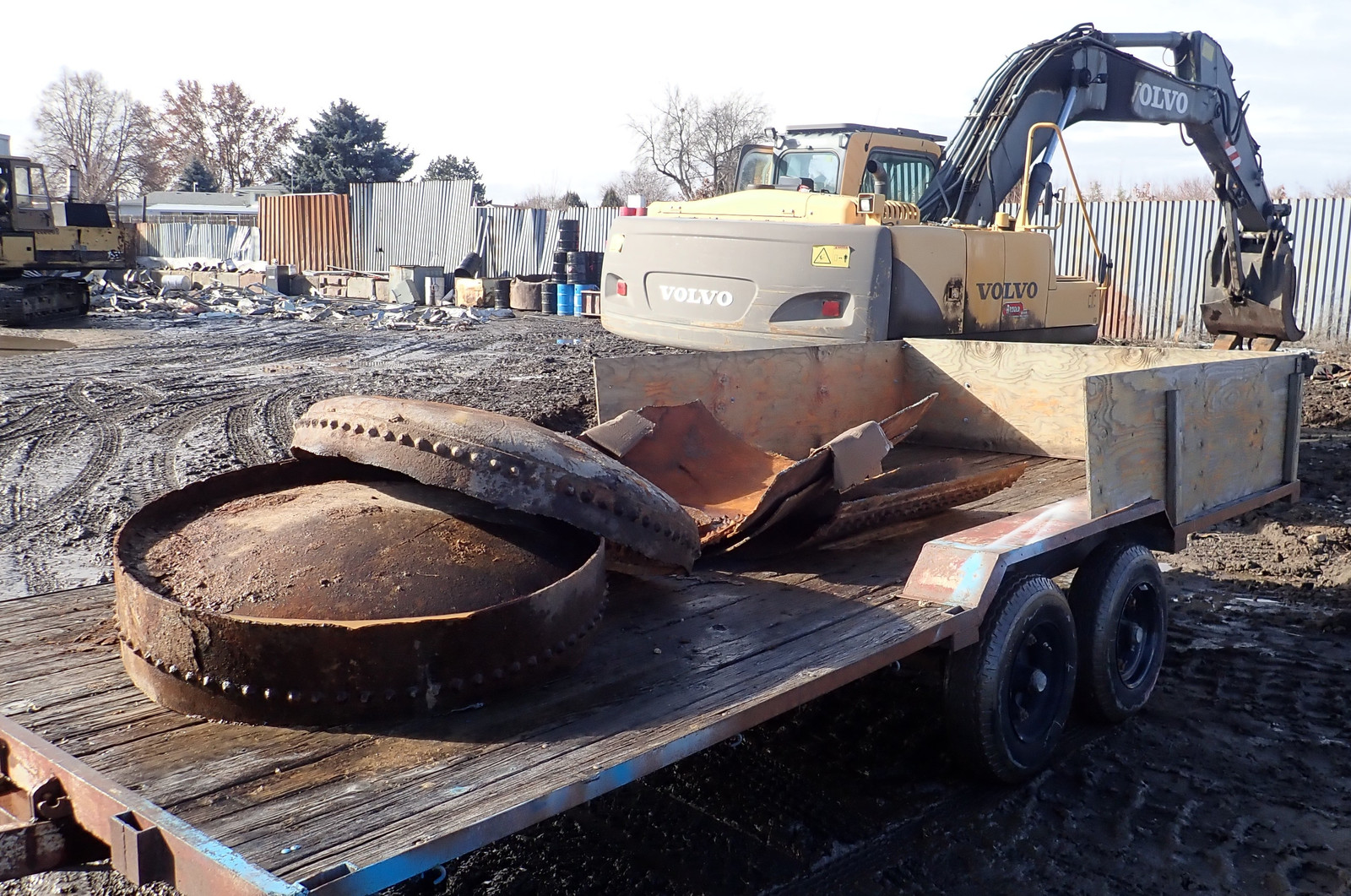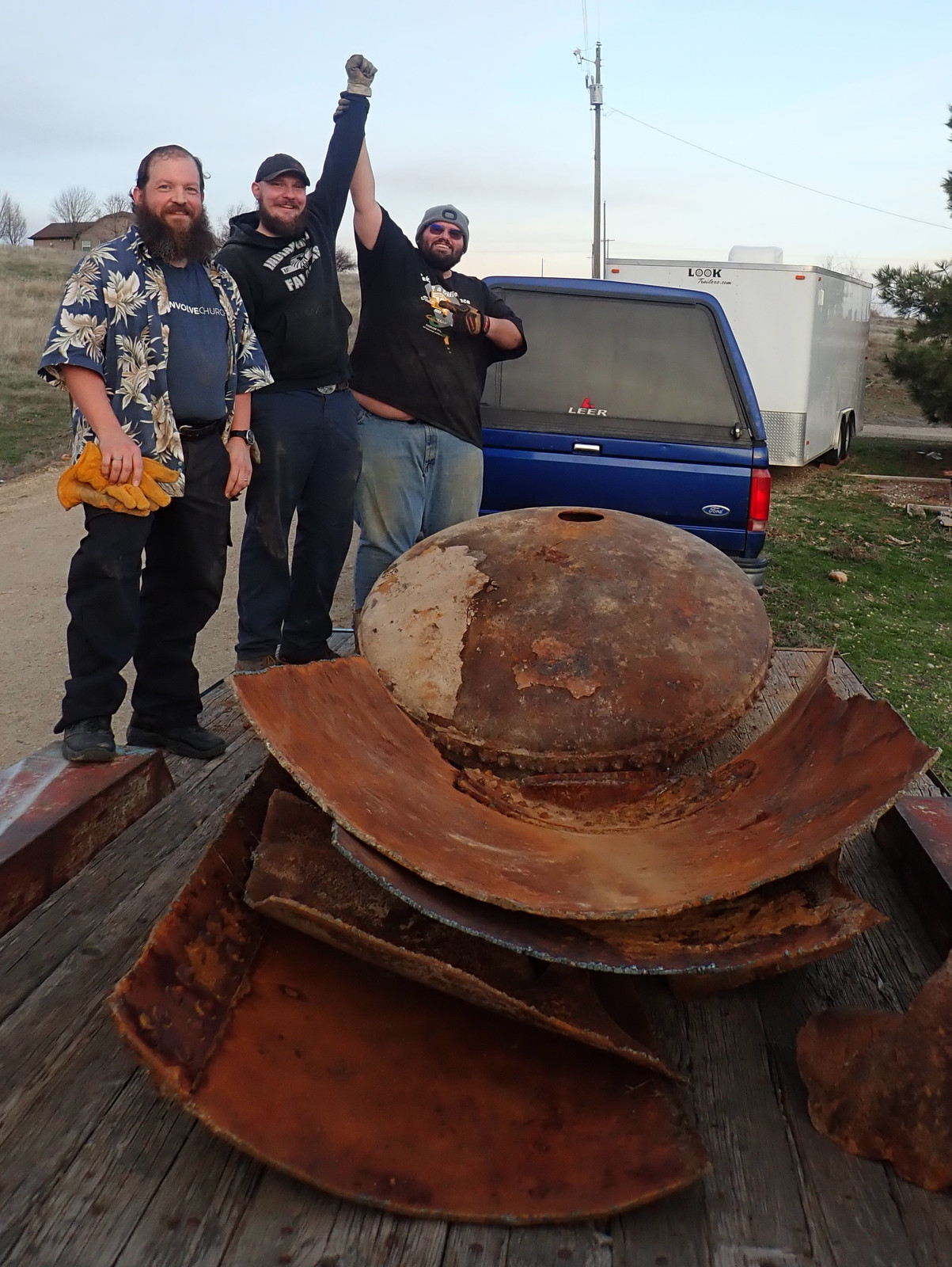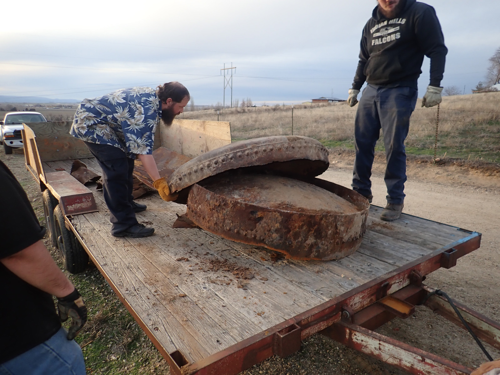 Unfortunately, instead of being “one tank laying around,” it’s now “a lot of pieces of tank laying around.” And that is best solved by a run to the scrap yard. As much as “random ancient plate iron” might be useful to some people, it’s not useful to me, the iron is not in good shape, and I just want it gone. Pieces were sized to be loadable by “a few guys lifting” - so, one particular Monday evening lifegroup after things had dried up, I brought the trailer up, handed out work gloves, and a few people got to work.