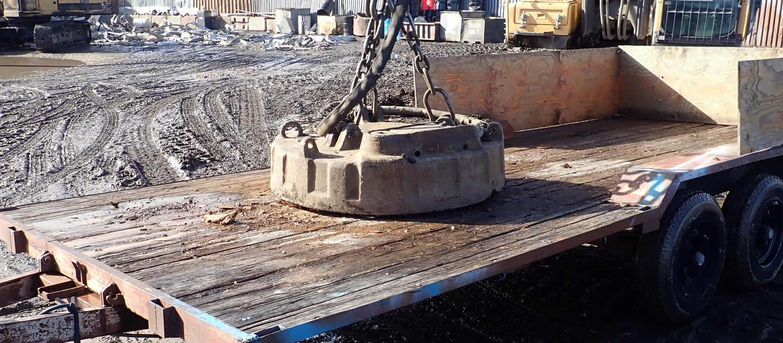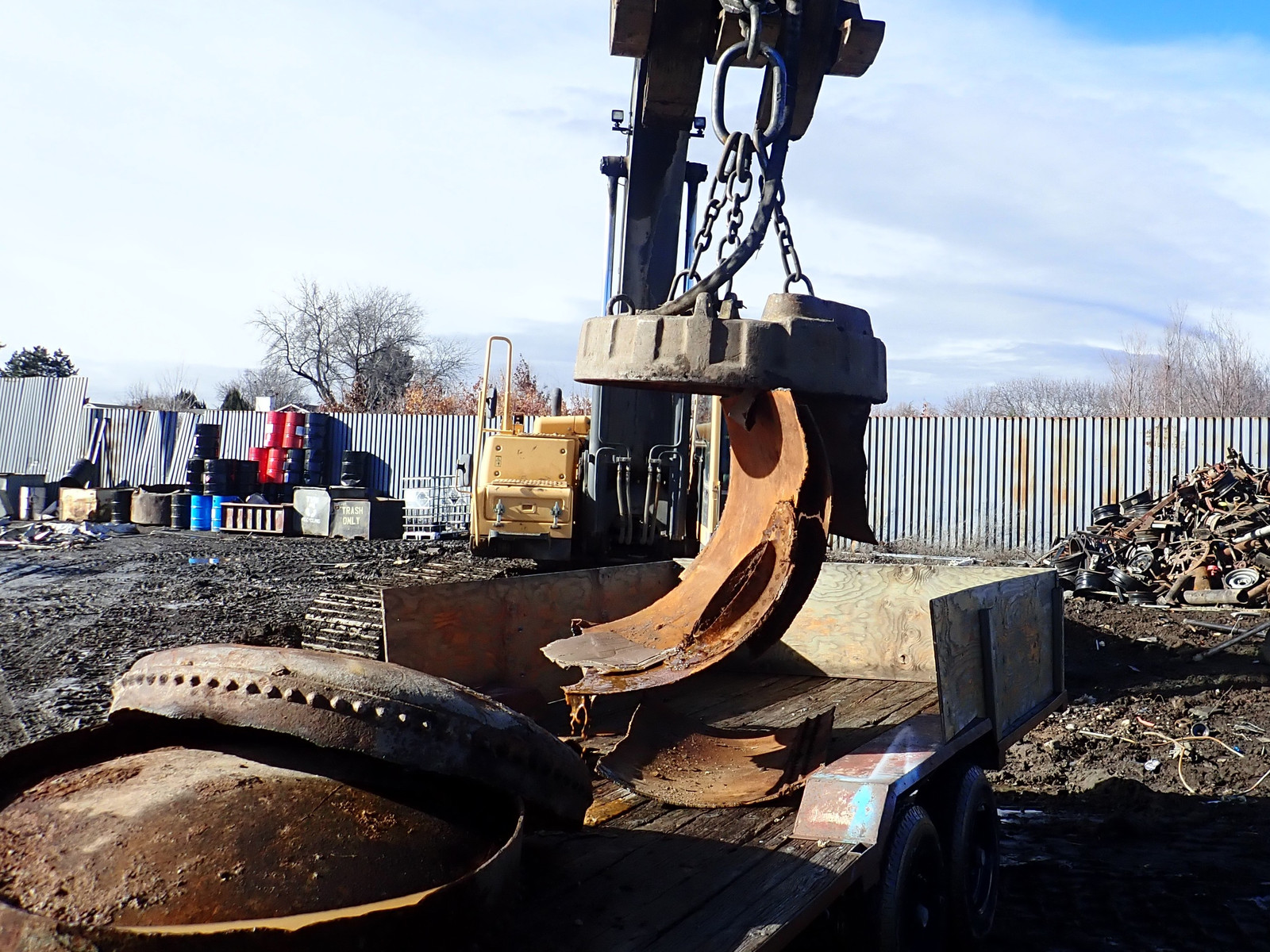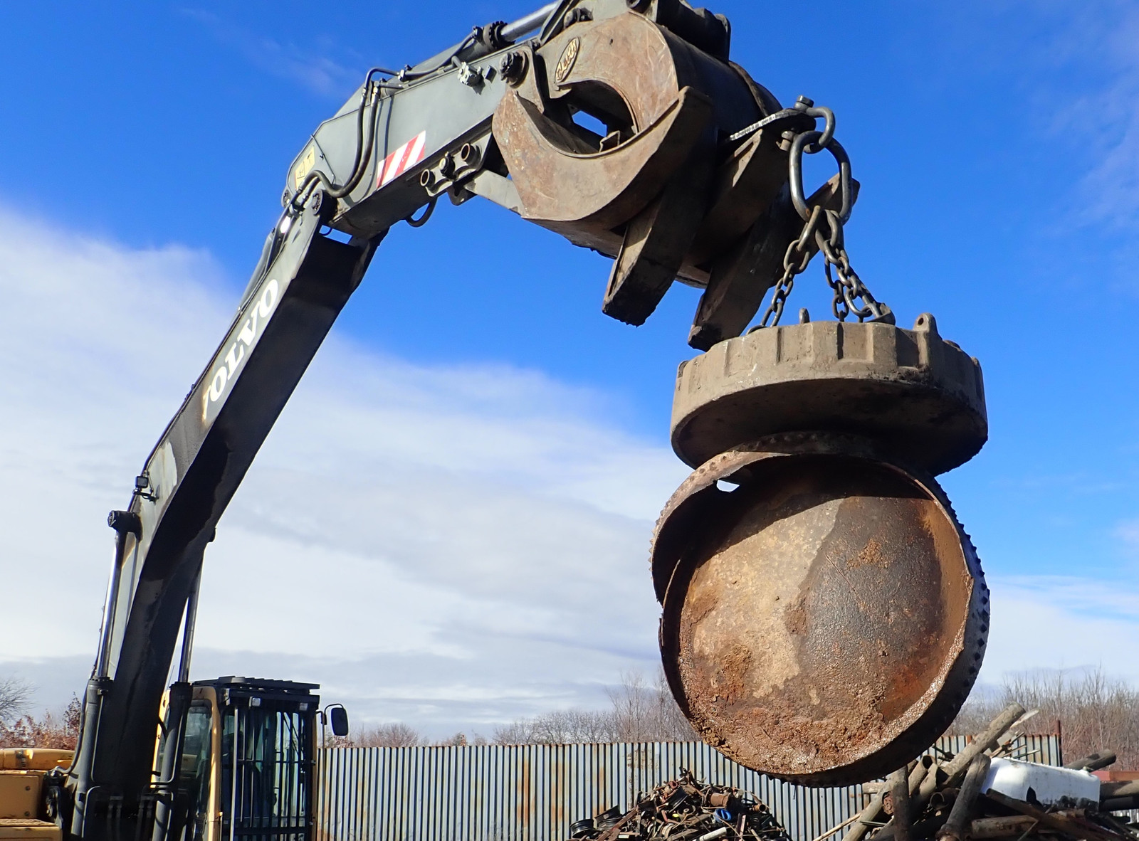A big electromagnet on big machinery! They’ve got a magnet chained up to an excavator, and it sucks the metal up. I’m amazed at just how strong it is - it grabs stuff by the edge without any trouble.