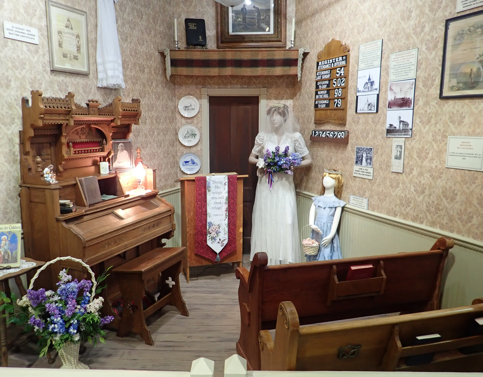An interesting way of laying things out I’ve not seen before is the use of “wedge” scenes. A square section in the center of the floor has walls making an “X” and then a center square, leaving some truncated wedges of space. In addition to making for a good display space, it’s a bit of a visual trick to make the spaces look longer. Here, some shortened pews from a local church and an old organ make for a late 1800s-esque church scene, with history about the local churches scattered around.