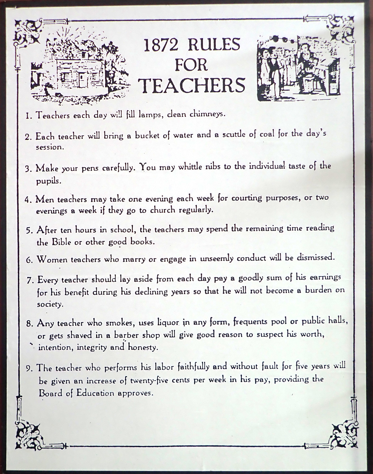 It also contains a copy of the “1872 Rules for Teachers” poster, available in the gift shop. I assume this is a replica of something that was common enough, given how frequently I see it floating around. Filling lamps daily makes sense to me… though a good lamp only needs filling every few days.