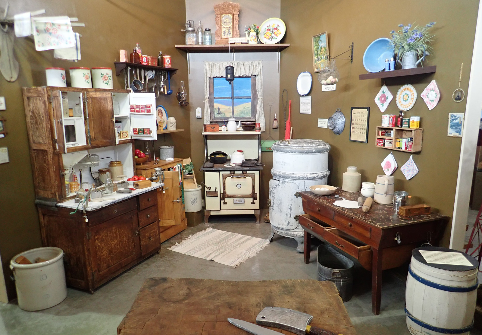 Moving further around, there’s a late 1800s to early 1900s kitchen, of the sort likely found out west in rural areas. You’ve got a big icebox in the back right, and a standard counter/cabinet with all sorts of useful attachments on the left. The counter on the right has large flour bins in the bottom - it seems to be designed for bread-work.