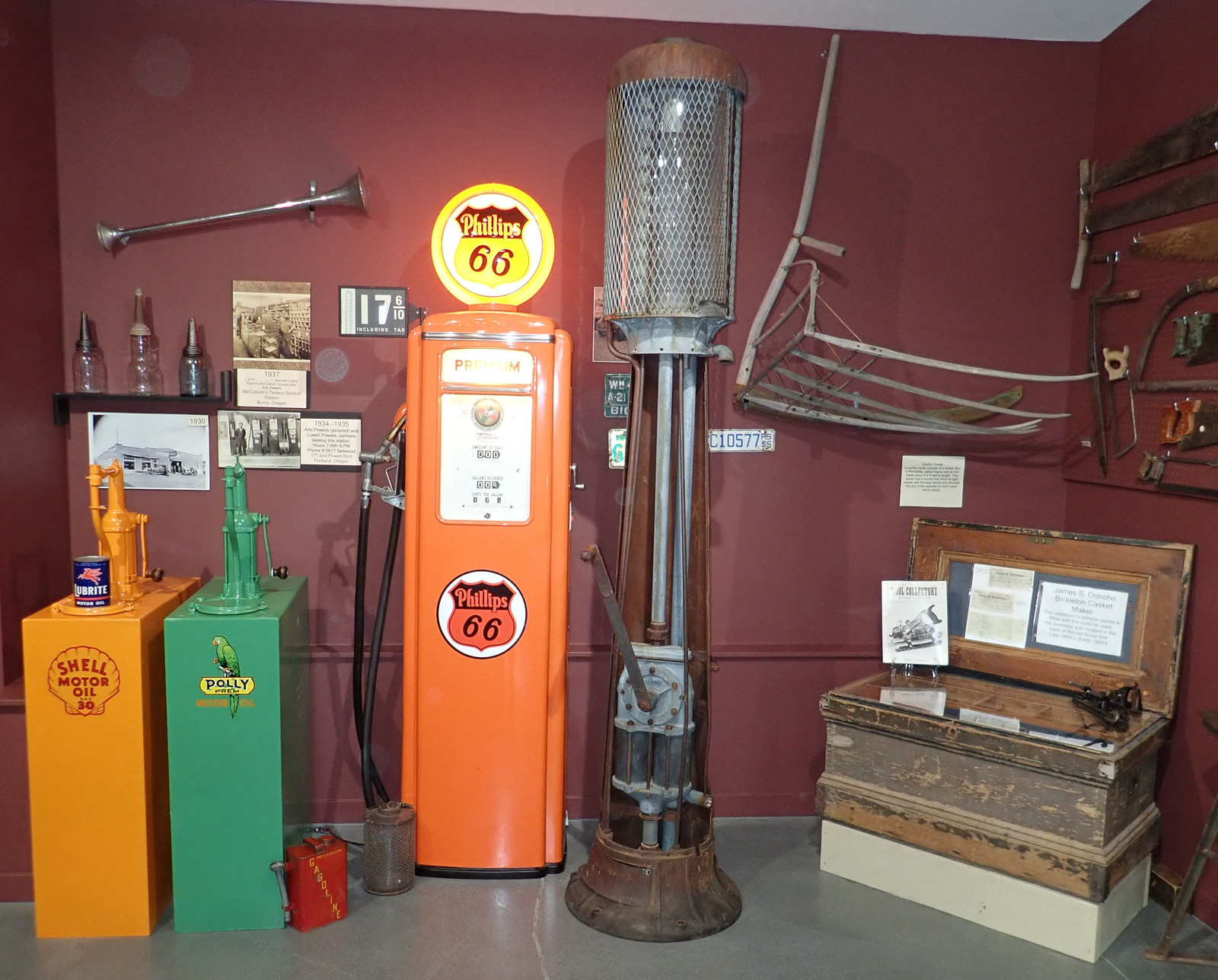 Gas pumps! The style on the right is interesting if you’re not familiar with how they work. The clear glass globe at the top is filled to the desired level, and then it drains down through the hose into your car’s tank. You don’t just “fill ‘er up!” - you need to have a good estimate of how many gallons the tank will fit before you start the process, or it’s going to make a mess. I’m pretty sure there’s a way to drain the excess back into the underground tanks, but it’s a far less precise process than the metering pumps that keep track of both the amount of fuel and the cost as you pump.