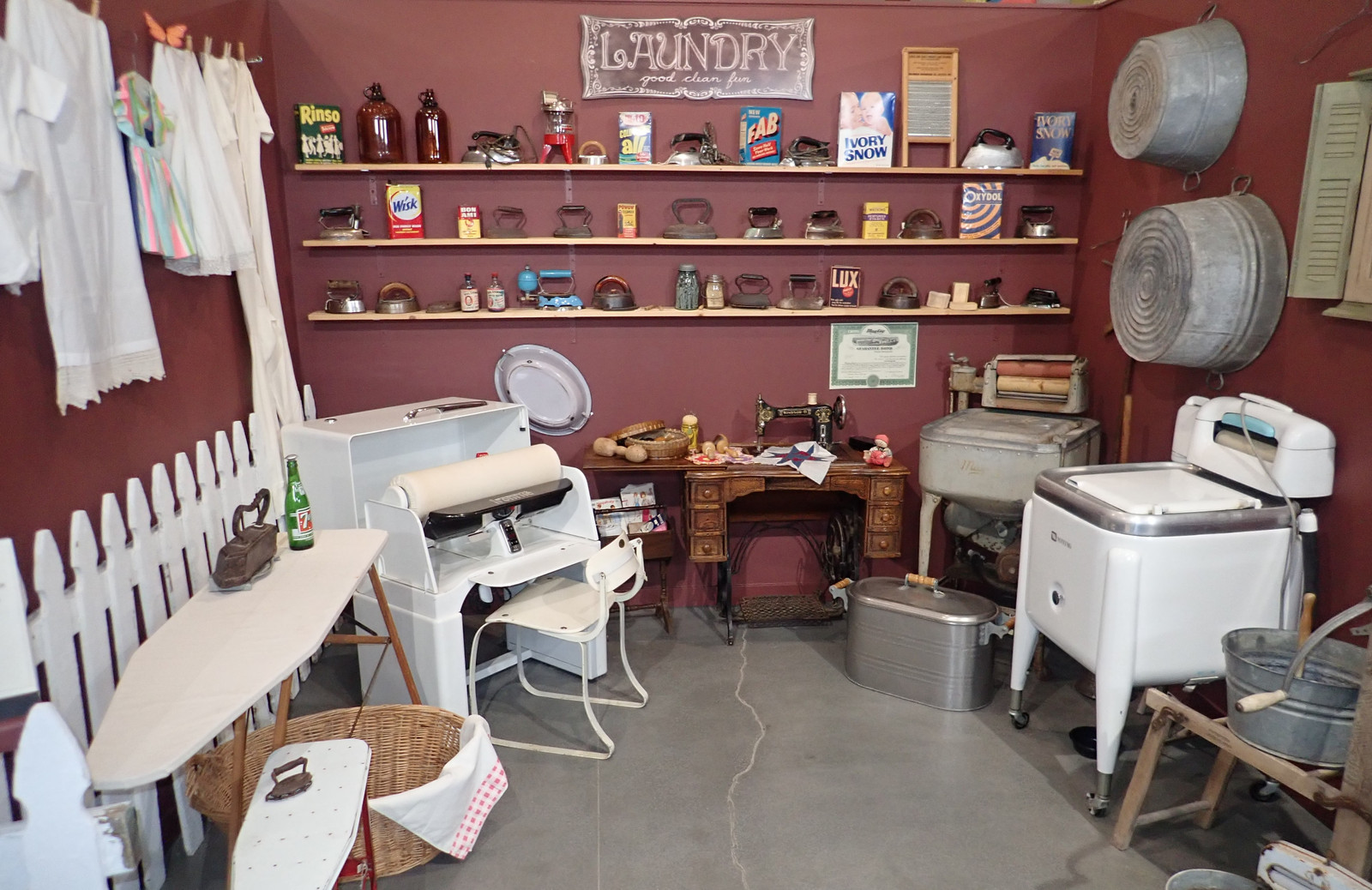 Finally, a laundry room that seems to be of the 1930s-1950s era, based on the equipment. I recognize some of it from my grandparents house, though I never actually saw the ironing roller get used.