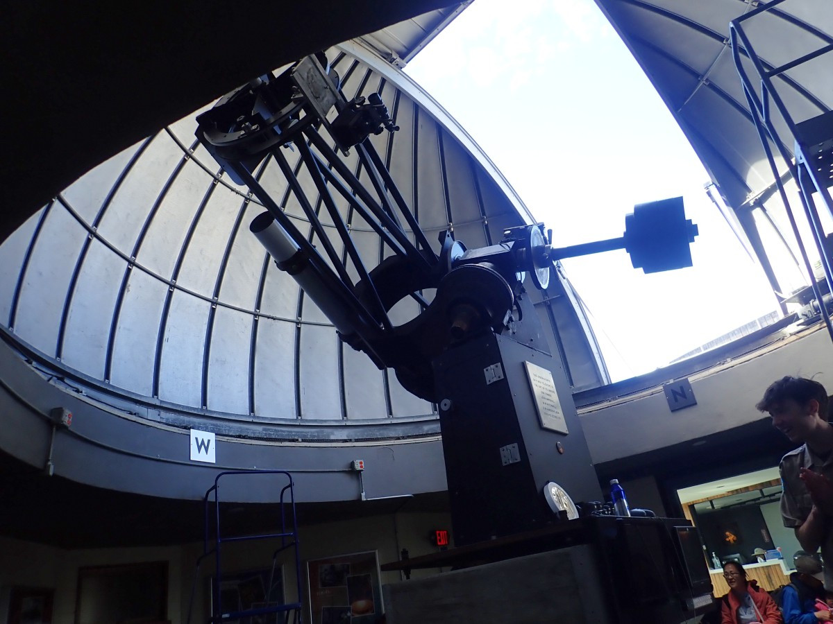The main telescope was originally a 24.5” Cassegrain reflecting telescope, converted to a Newtonian design during the refurbishment in 2016-2018. For the solar observations we used the smaller refracting telescope on the side with a sun shield over it (think “eclipse glasses,” but for a telescope). The mount used here is an older style that allowed for easy tracking of stellar objects before computerized tracking was a thing - it simply counters the earth’s rotation mechanically.