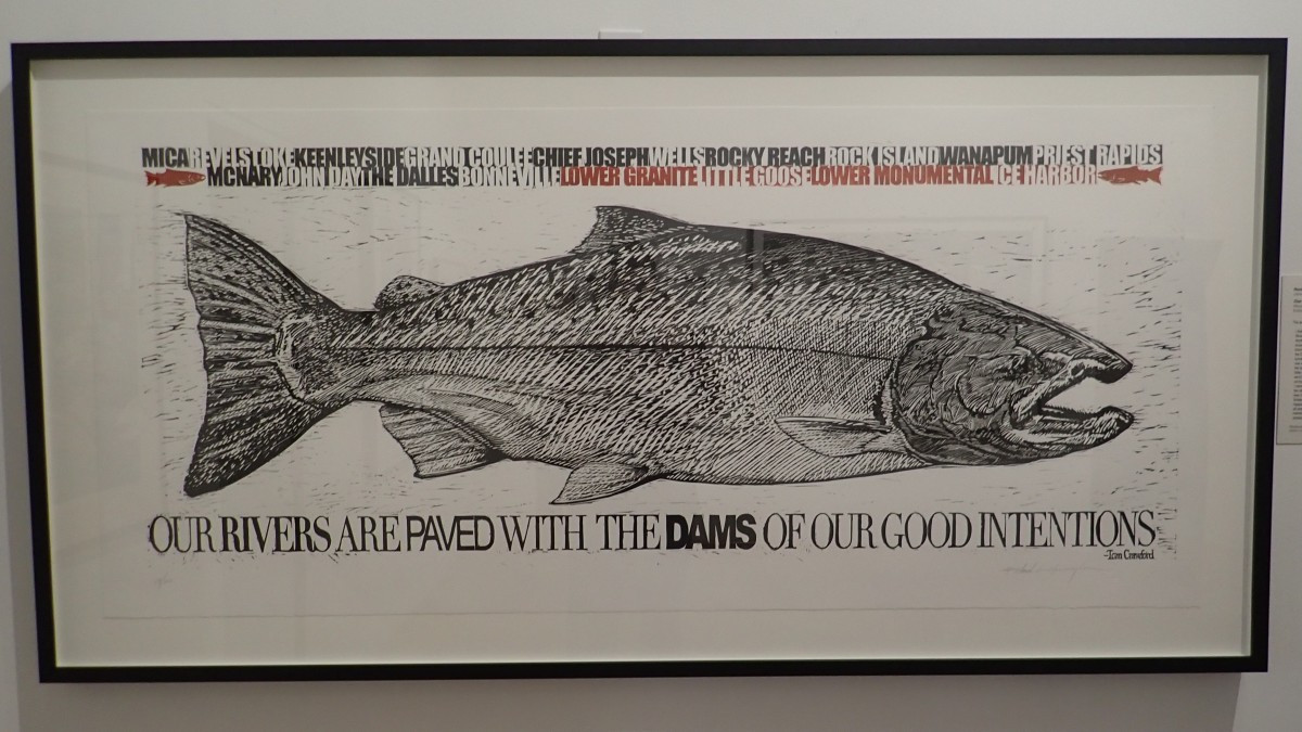 Another section of art currently on display relates to the Columbia River, and this particular bit of art (“Our Rivers are Paved” by Richard C. Harrington) argues for the removal of several dams on the river that interfere with the giant salmon that used to spawn in the river. As time goes on, it seems that some of the damming of rivers was a bad idea, ecologically…