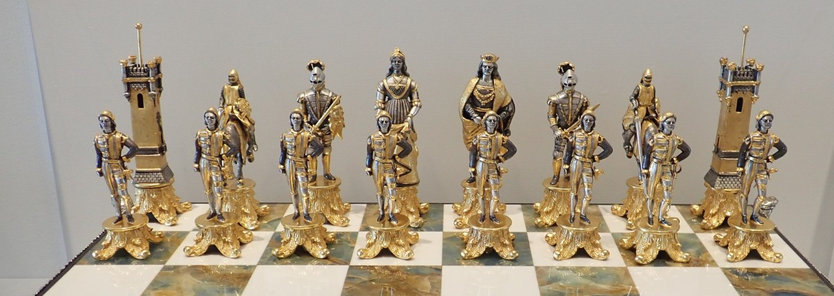 This beautiful set, by Guiseppe Vasari, is is gold and silver fused onto hand-cast Italian brass. Pictures really don’t do the pieces justice - I had to shoot through the plexiglass cases, and my camera really struggled with aspects of that.