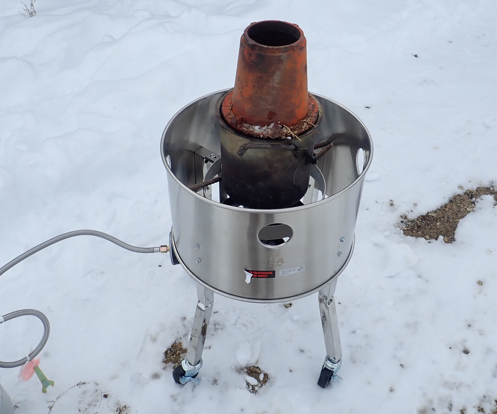 I haven’t had time to get the larger pots modified yet, so I decided to try out my fancy new burner with the small, bottom venting pot - and I learned several important things! First and foremost, I need a bigger propane tank, because this burner can consume way more propane than a 5 gallon tank can provide in the winter. Or perhaps there’s a flow limiting device somewhere in the chain.