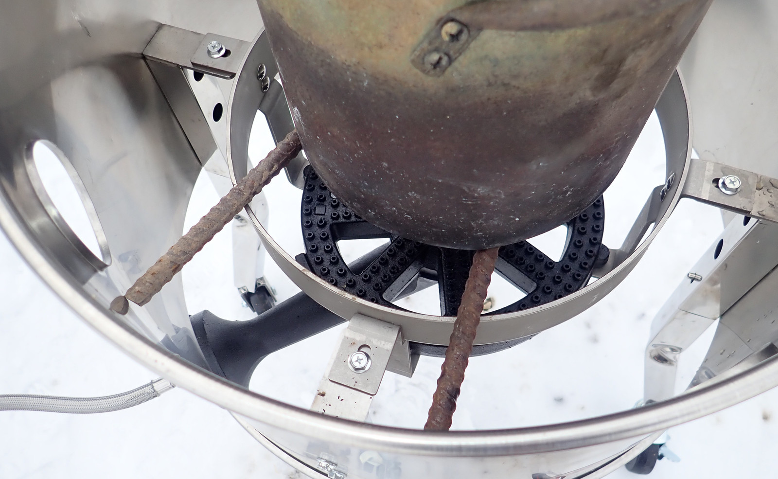 Initially, I started out with the pot supported on a couple pieces of rebar - it’s up where it’s designed to be, and while I wasn’t sure how it would work that far from the burner, isn’t that the point of experimentation?