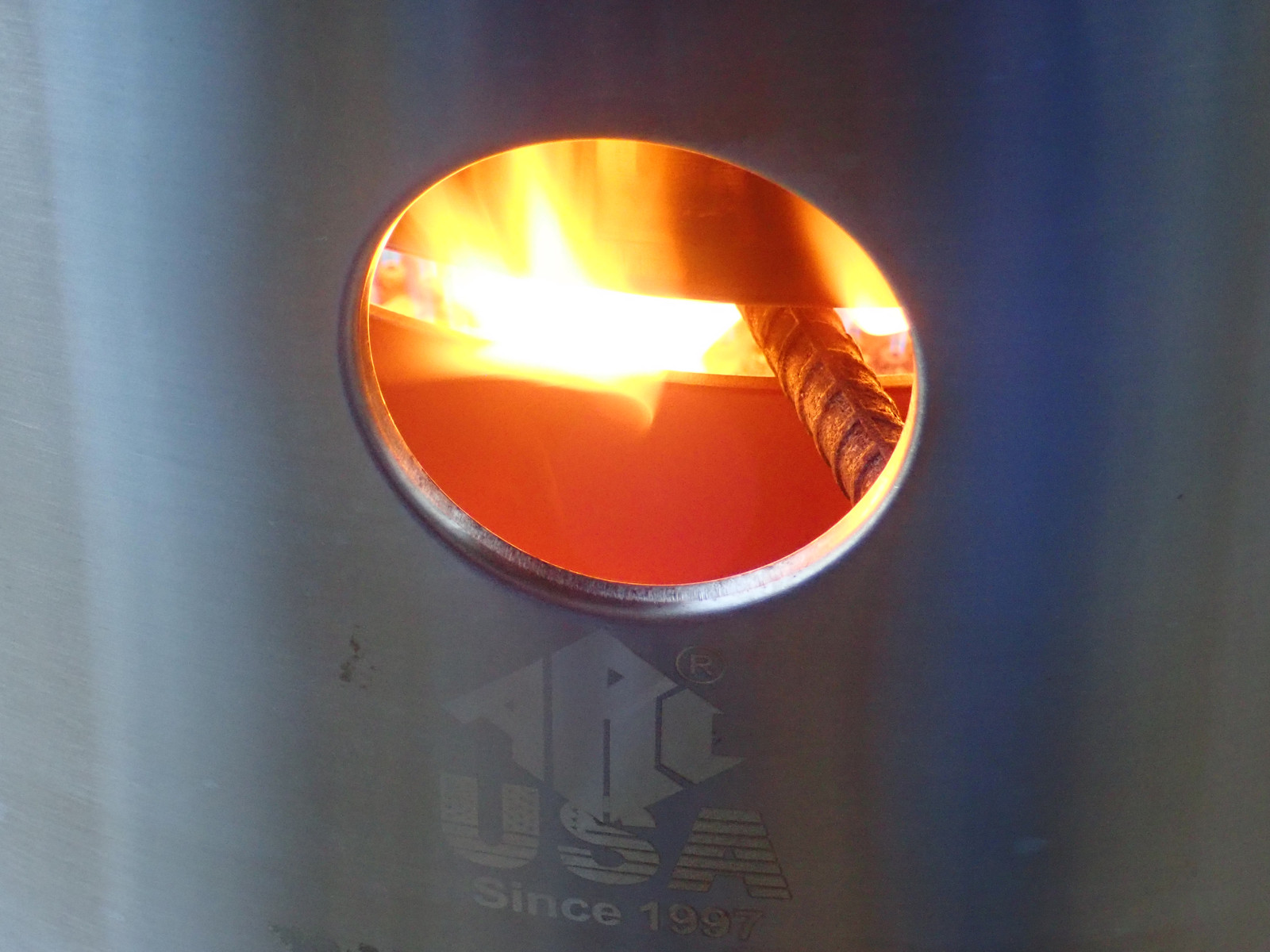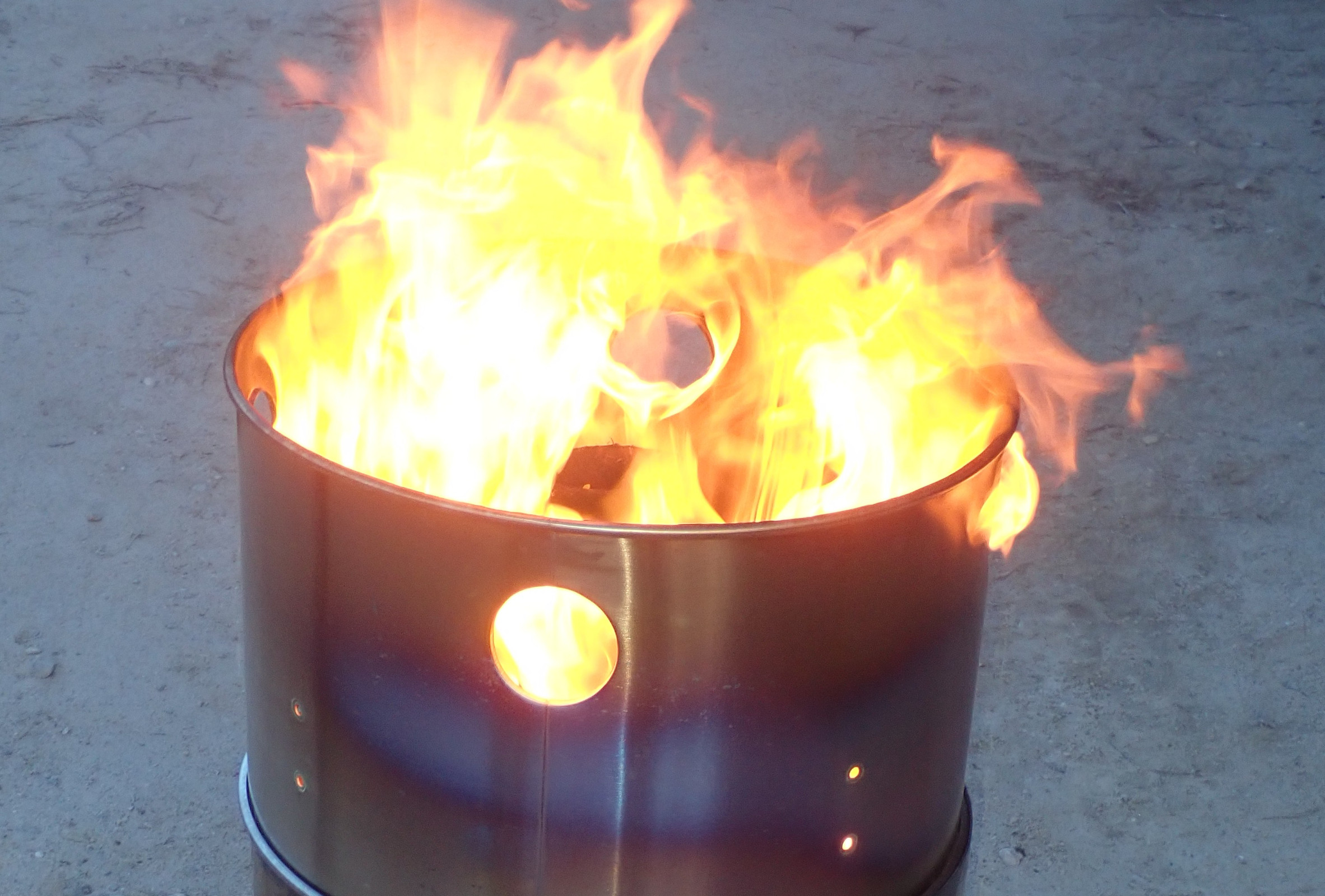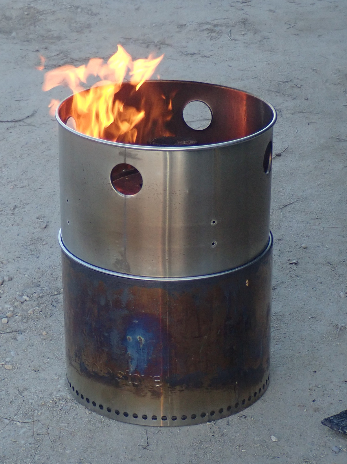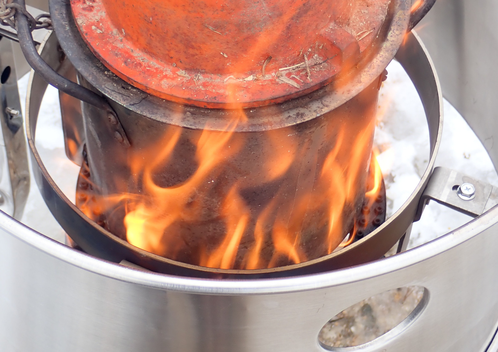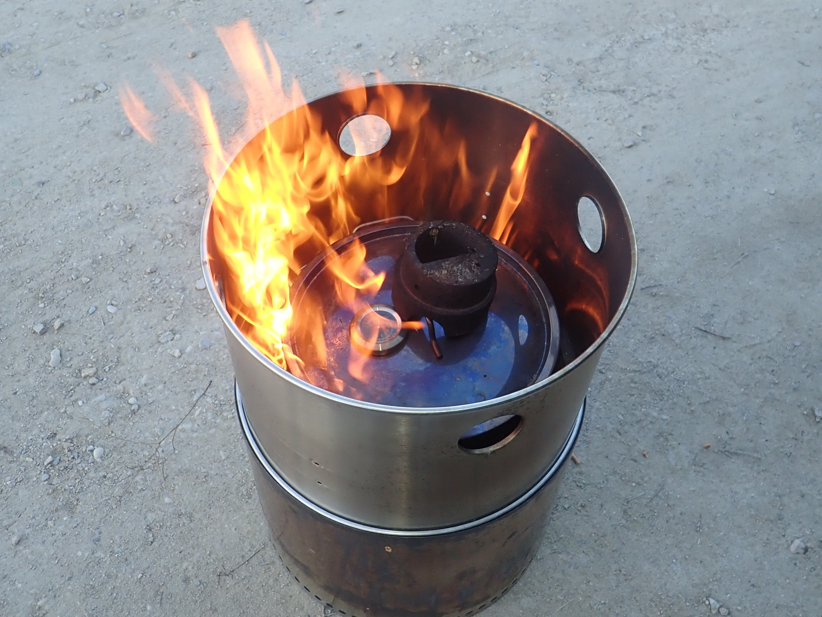 I concluded that I had two problems with the propane fired system: the loose shroud let too much heat escape, and it didn’t really let the burning gases tuck tight against the pot to transfer heat in. I’d not thought about running this pot in the Solo Stove before because it would have choked out the fire - but… how would it contain the venting gases? Would they burn well?