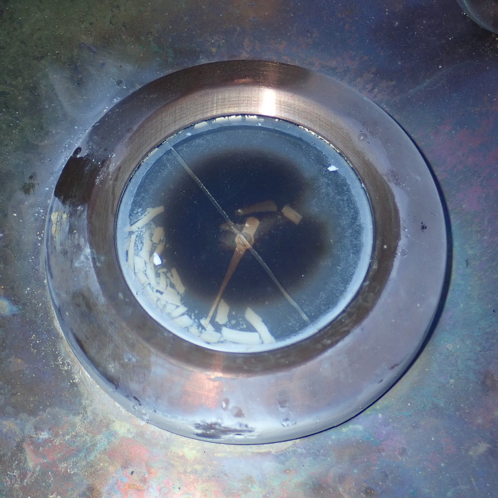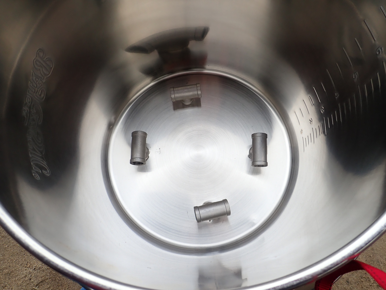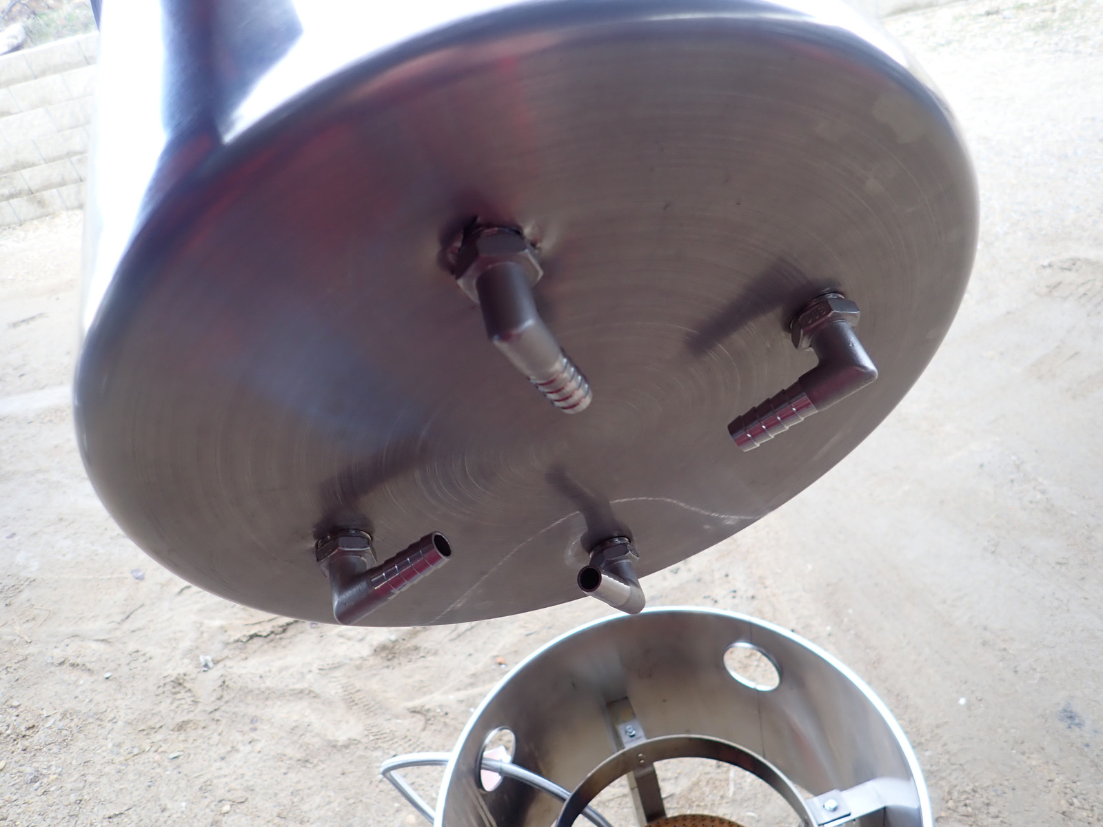 After some abusing of the pot with a drill press and some old taps, I managed to get my four jets screwed in fairly tightly to the bottom. It’s not perfect, there’s some leakage, but I’m happy enough with how they work. You’ll notice that I’ve offset them from each other - my goal, which it turns out was successful, is to get some swirl going under here to help things mix and to help ensure there’s stable combustion of the venting gasses under the pot.